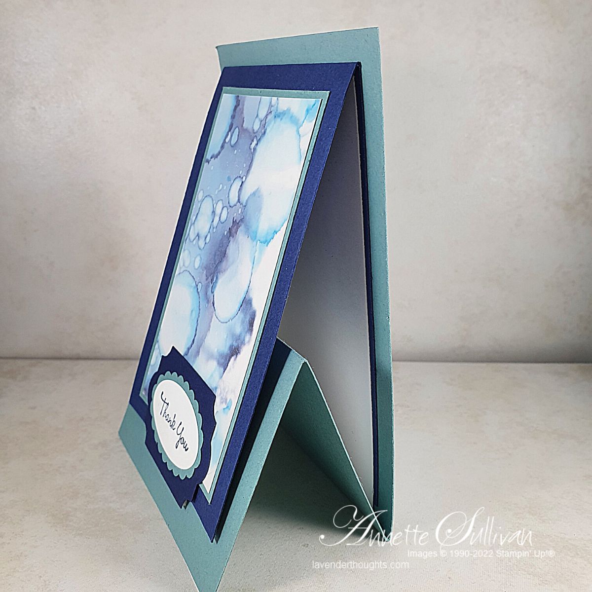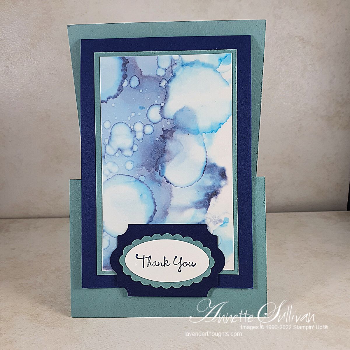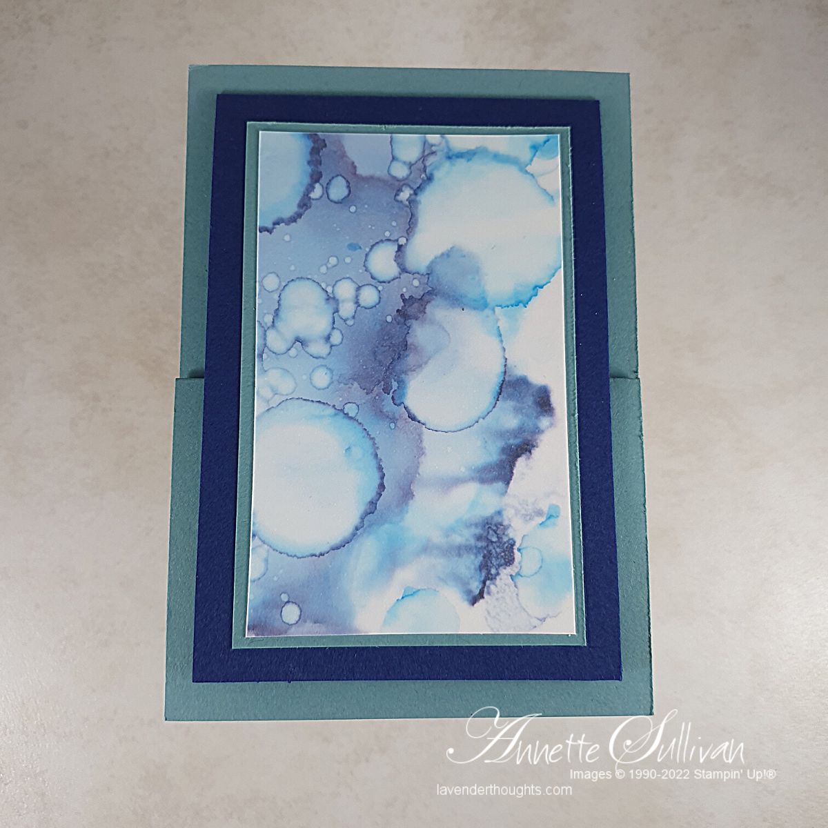 Card 2 – this one tucks the easel into the bottom. I have used the Blended Alcohol Background technique. Lost Lagoon, Night of Navy and Basic White cardstock were used.
