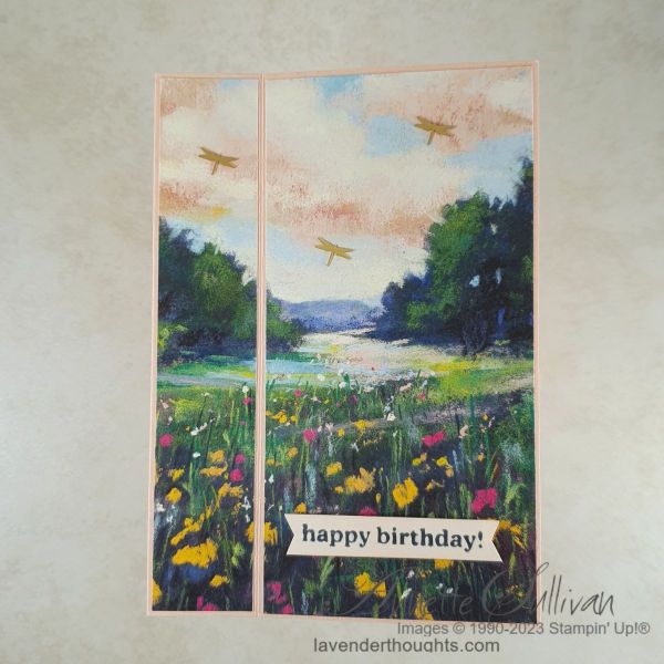 Card 1 is on a Orchid Oasis card base and uses some of the Adhesive-backed dragonflies and birds.