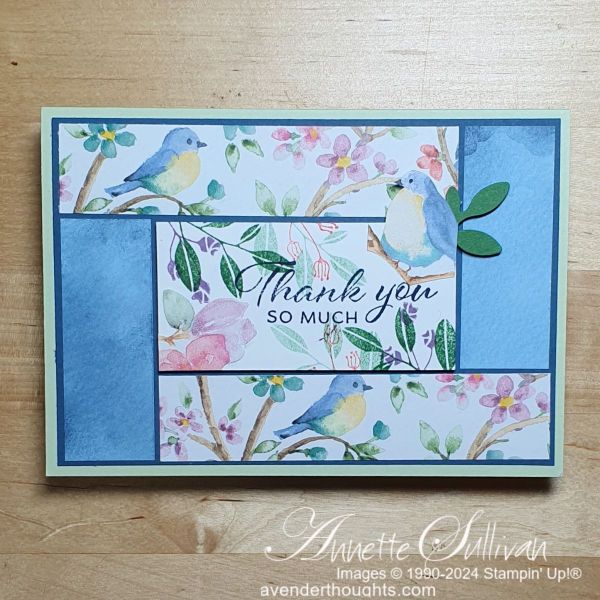 Card 3: I have used the DSP on this one to create a patchwork look as well as fussy cutting one of the birds and some flowers and then stamping on the centre panel. Layering Leaves stamp set and Bough Punch were used.
