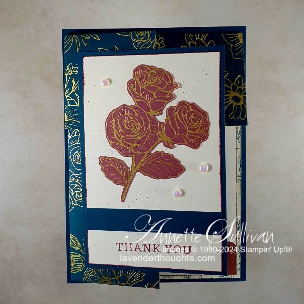 Card 2: This one also uses a Pretty Peacock card base and another piece of the Forever Love Specialty DSP. The image on the front was fussy cut from yet another piece of the same DSP.