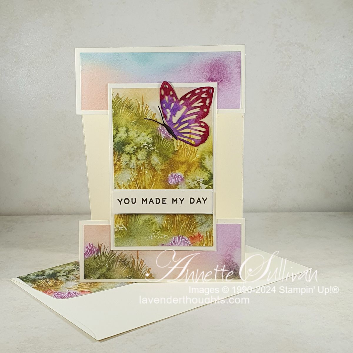 Card 1: The very pretty Thoughtful Journey DSP and coordinating Memories & More Pack were used on a Very Vanilla card base. The butterfly from Paper Butterfly Accents was coloured with Stampin’ Blends alcohol markers and the heat embossed with Clear Embossing Powder.
