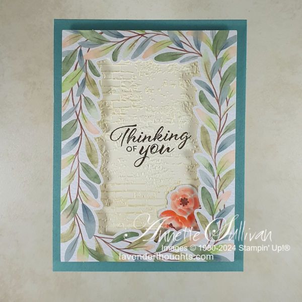 Card 2: The card base is Lost Lagoon. A sentiment from Layering Leaves was stamped with Early Espresso ink on a piece of Very Vanilla. This was embossed with the Exposed Brick 3D Embossing Folder and attached to the card front. A die cut frame was attached to the embossed layer with Dimensionals. A floral die cut was added in between the frame and the embossed layer More die cuts decorate the inside and the envelope.