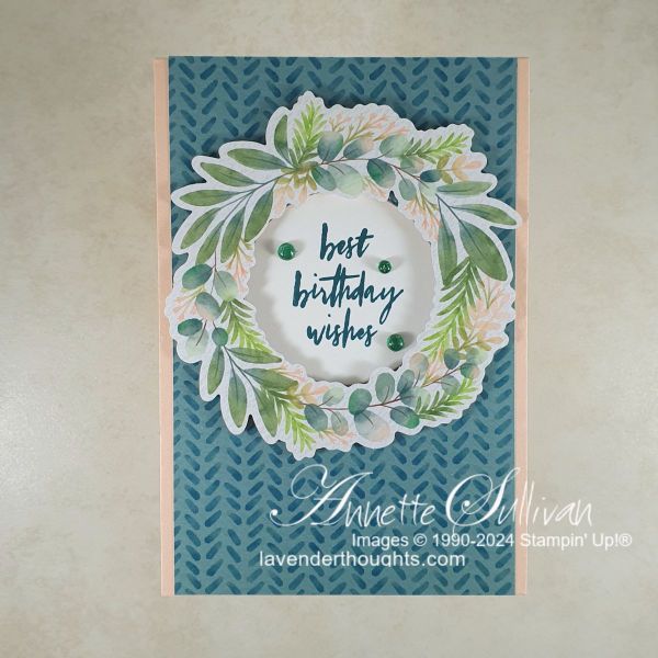 Card 1: This uses a die cut wreath, die cut flowers and a 6″ x 6″ piece of DSP. The card base is Petal Pink. A circle was punched through the DSP and cardstock with the sentiment from Poised Peony being stamped onto the inside piece. The 6×6 DSP creates a layer for the front of the card as well as for the back flap of the envelope with a small strip at the base on the inside of the card.