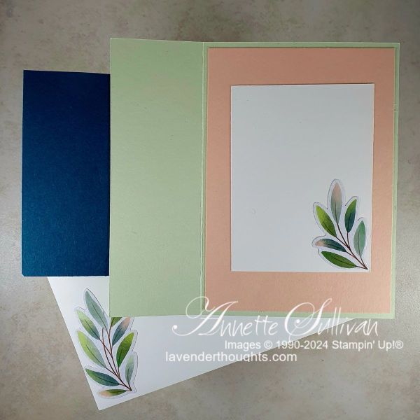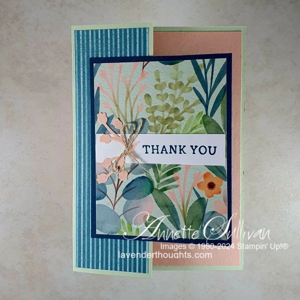 Card 4: A fun fold for this one. Take a standard card base and trim 5cm (2″) from the right hand front. This Soft Sea Foam card base has a strip of Subtles DSP along the front edge and a Petal Pink layer attached to the inside of the card. The 3″ x 4″ piece of DSP is layered onto 3¼” x 4¼” Pretty Peacock and attached to the centre of the front strip. The inside Basic White piece is also 3″ x 4″ and is attached so that it is hidden when the card is closed. A die cut piece was attached to the white. The sentiment from Simply Said was stamped in Pretty Peacock on Basic White and added to the centre of the front panel. The Bough Punch provided some Petal Pink embellishments and a Linen Thread bow brings it all together.