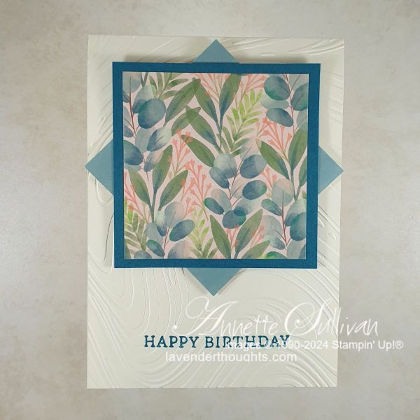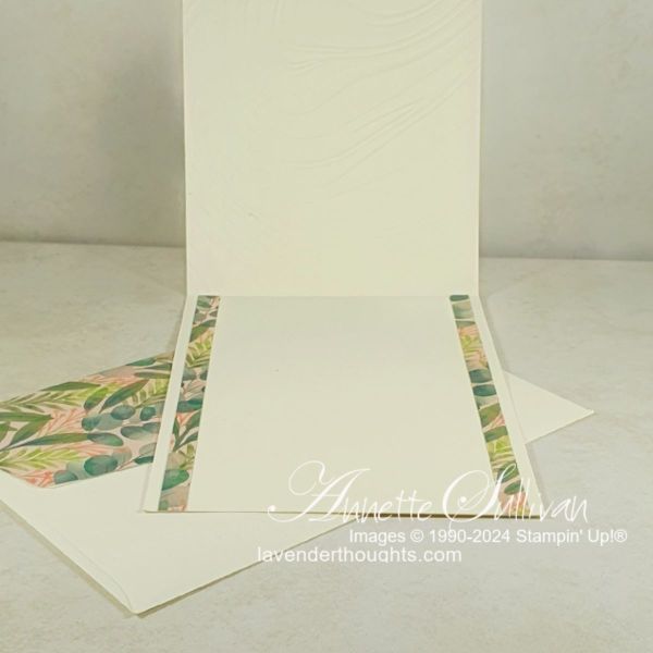 Card 3: A thick Very Vanilla card base was stamped with a sentiment from Simply Said and then embossed with the So Swirly Embossing Folder. This card uses a 6″ x 6″ piece of DSP. Two layers of DSP each 3″ square were used for the front of the card and the remaining 3″ x 6″ piece used to decorate the inside of the card and the flap of the envelope. The two pieces of DSP on the front are separated with a layer of Pretty Peacock that is 3¼” x 3¼”.