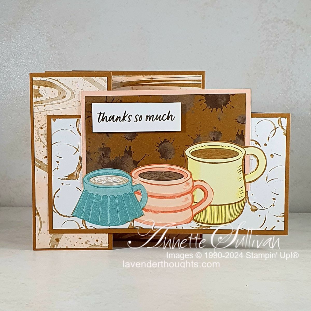 Card 3: This is a landscape version. It uses Pecan Pie and Petal Pink cardstock with A Little Latte DSP. The sentiment is from Latte Love. The coffee cups were fussy cut from the same DSP.