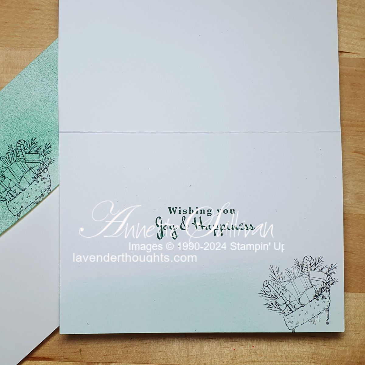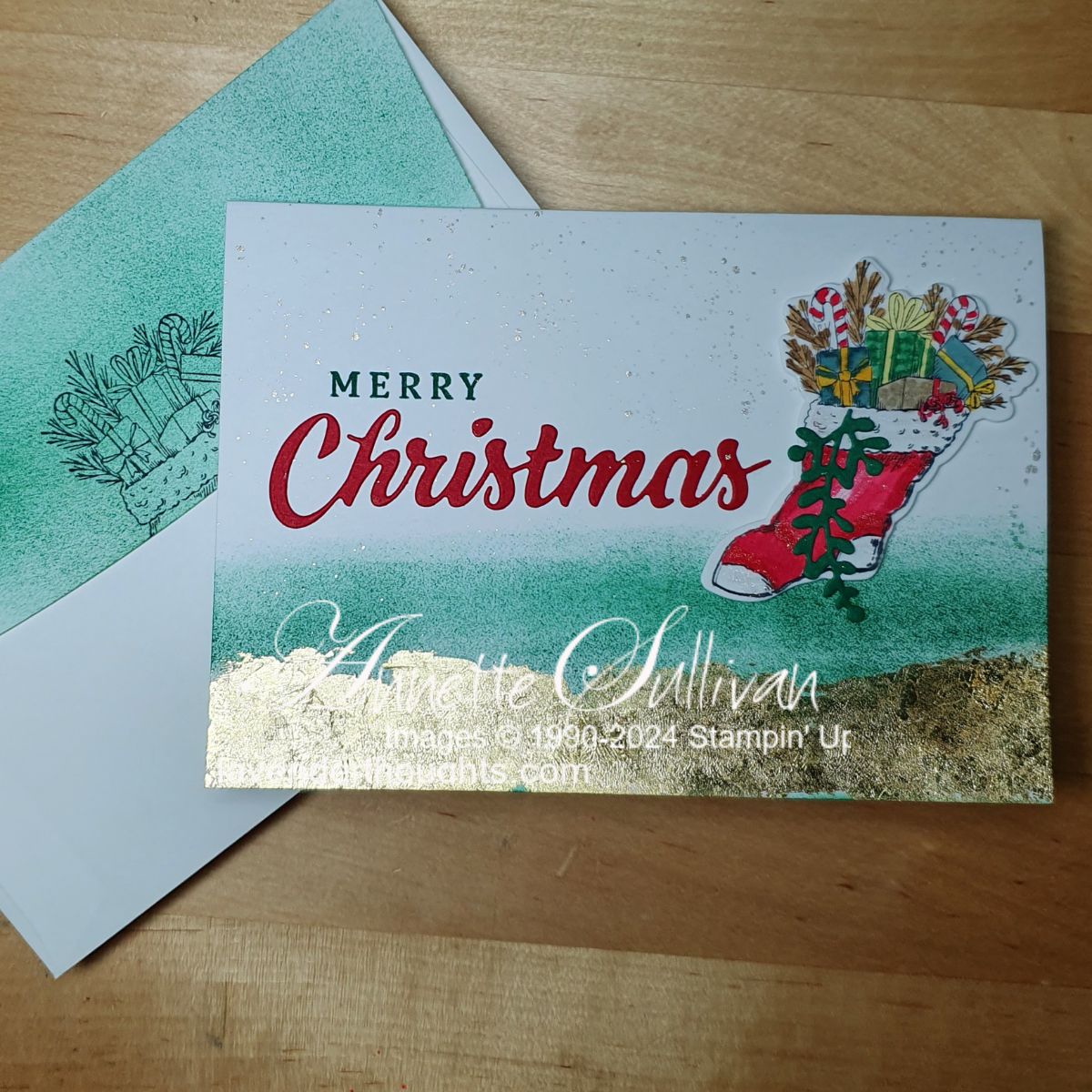 - The stocking is another image from the Sentimental Wishes set, coloured with Stampin’ Blends and die cut.