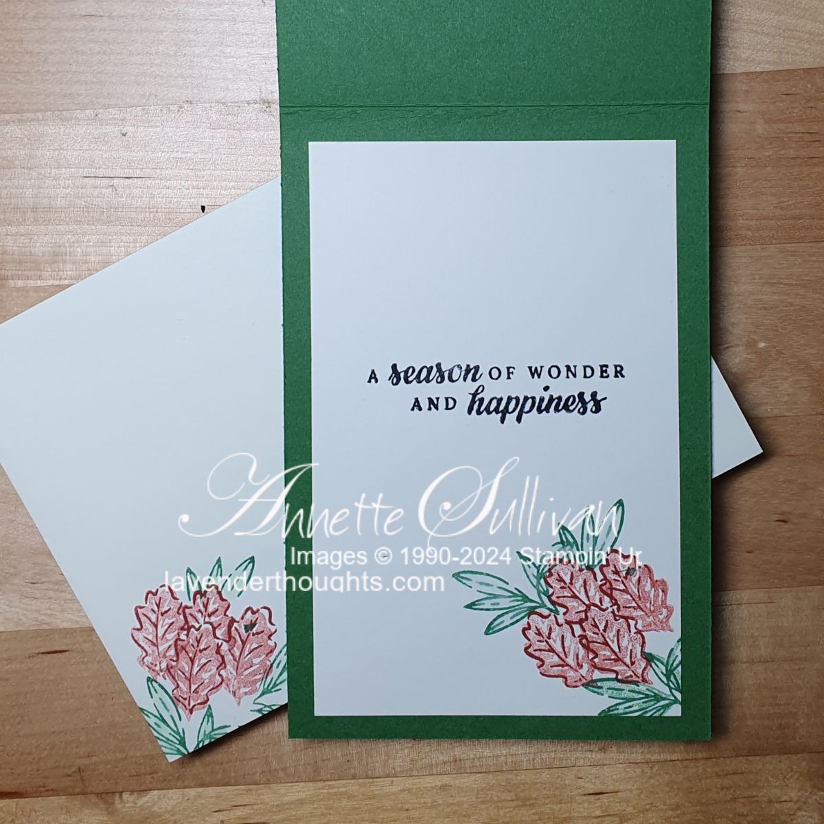 Card 3: A piece of Very Vanilla cardstock was embossed with the Birch Wood 3D Embossing Folder and attached to a Garden Green card base. Seven of the leaf image were stamped with Copper Clay ink, die cut and shaped into a massive pine cone. This was backed with some of the mistletoe / leaf images stamped in Garden Green. I then took a piece of Basic White cardstock and covered it with Copper Metallic Enamel Effects. Once it was dry, I used the Peaceful Season Bundle (also an Online Exclusive) to die cut the word ‘Christmas’ and stamp ‘Merry’ with Stazon Jet Black ink on a scrap of the copper covered paper. The inside and envelope were stamped to match the front of the card.