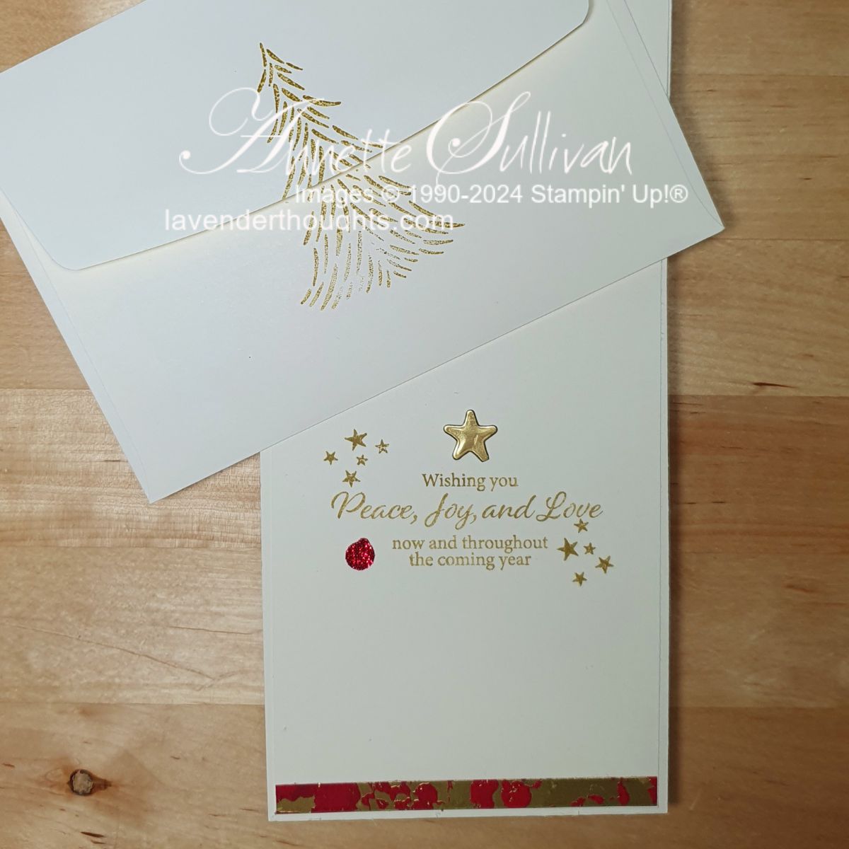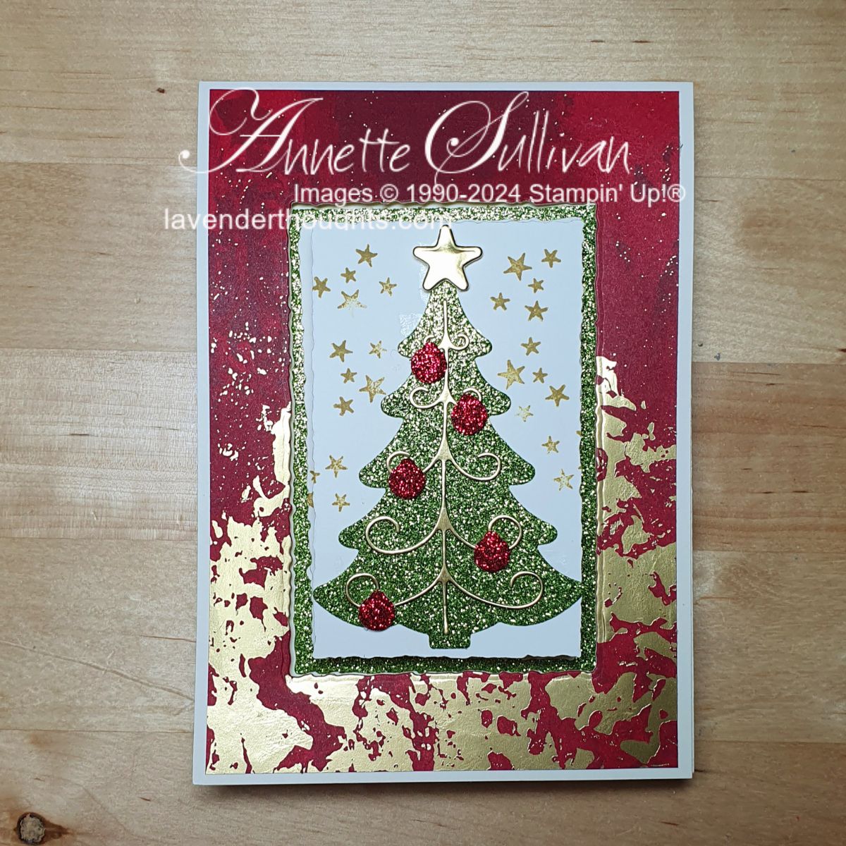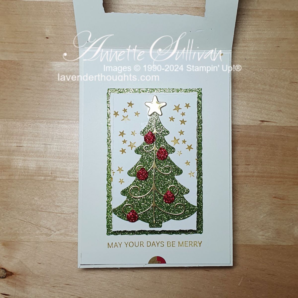 Card 2: This one provides an even bigger WOW factor. Because the pop up layer is quite large, I have added an extra ‘card’ on the inside to have space to write a greeting. The inside card is slightly smaller than the base card (0.5cm or ¼”). Deckled Rectangle Dies were used together with the Decorative Trees Dies. The card base is Very Vanilla with a layer of Seasons of Elegance Specialty DSP. The background layer and tree are from the Festive Glimmer Paper. The tree’s accessories use Gold Foil and Real Red Glimmer Paper.