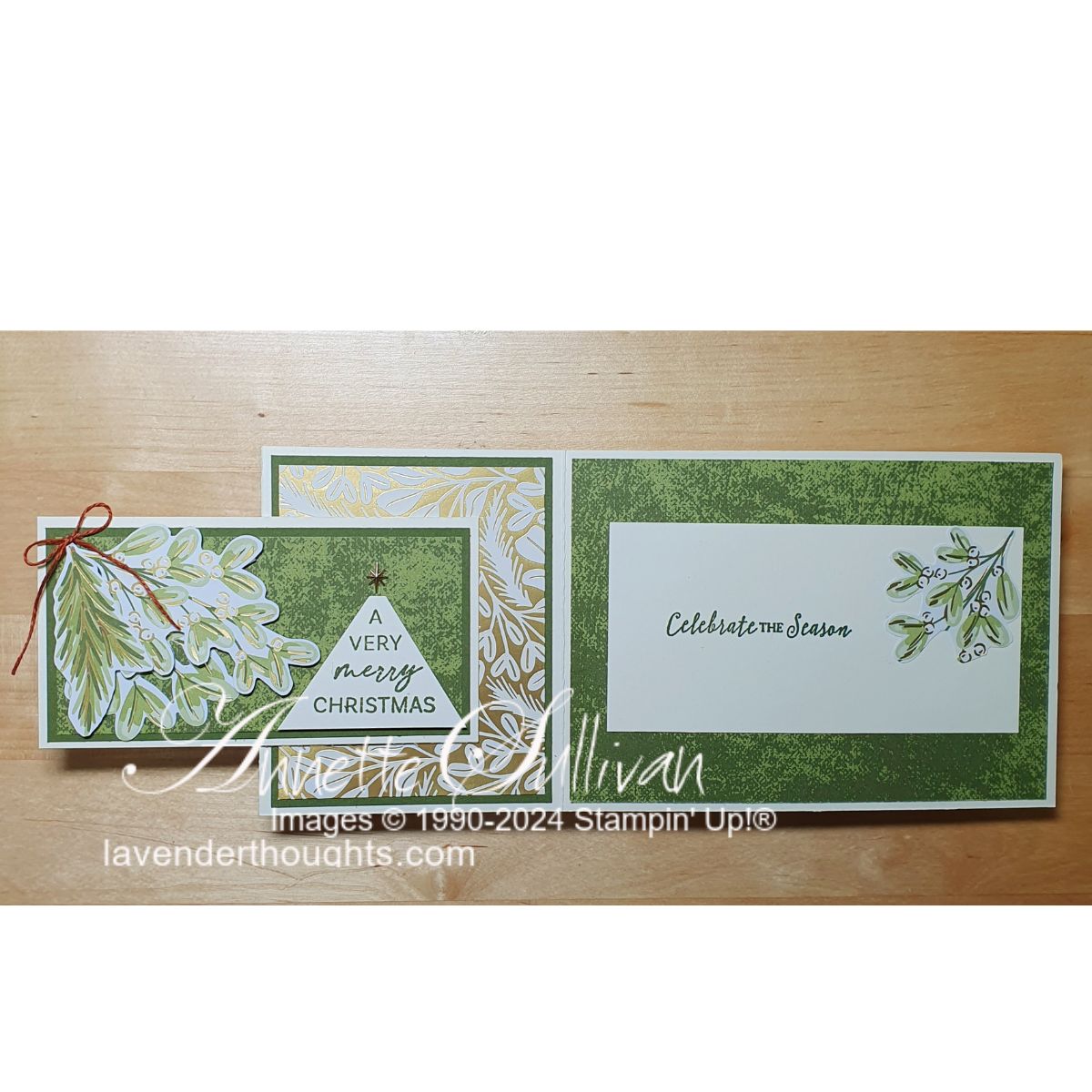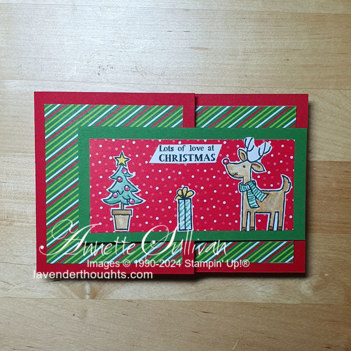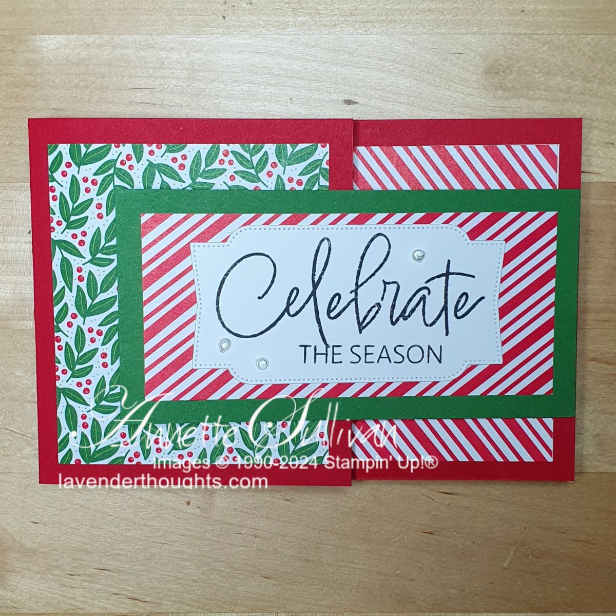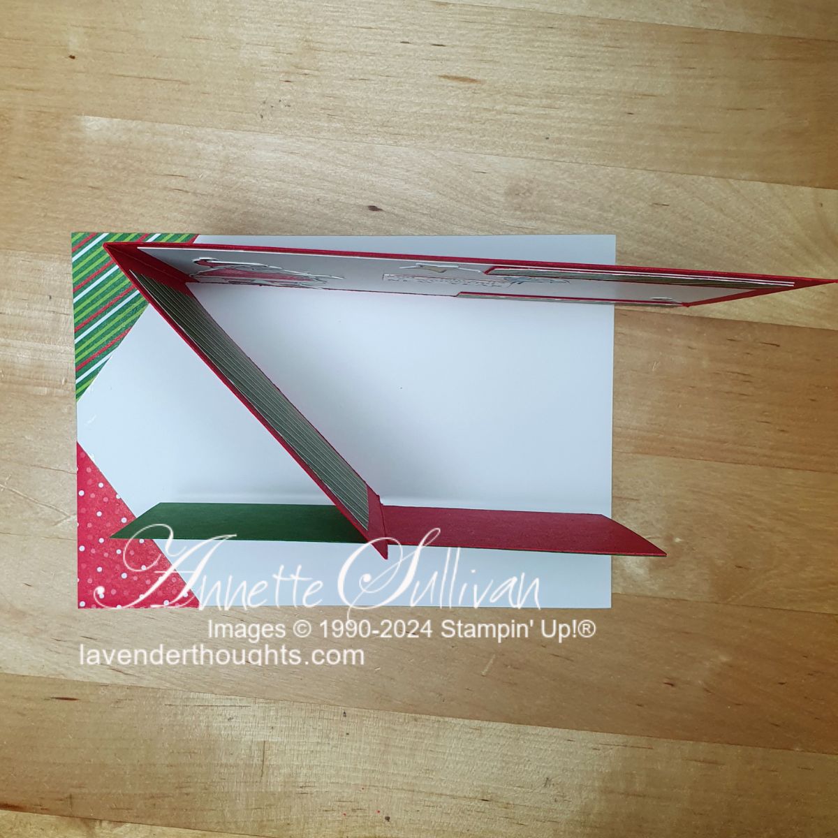 Cards 2, 3 and 4 were created from one sheet of 12″ x 12″ Real Red cardstock and measure 6″ x 4″ when closed. The Real Red card base has Garden Green cardstock and Take A Bow DSP layers for all three cards.