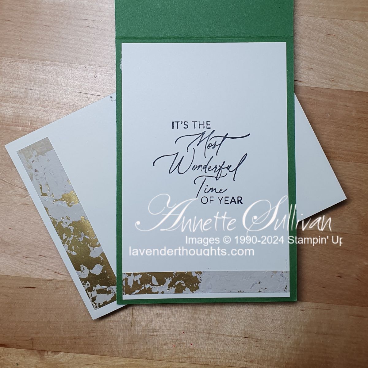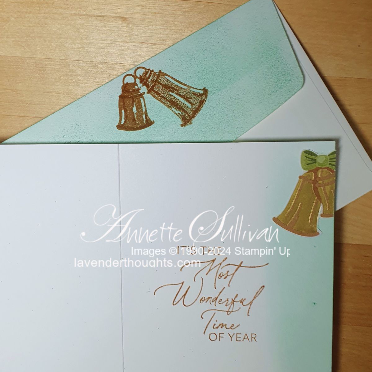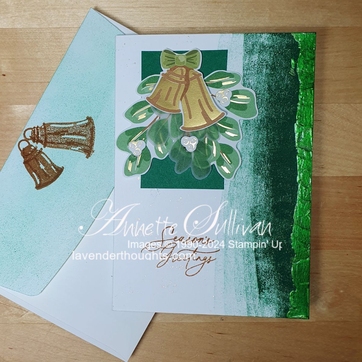 Card 1: Add Shaded Spruce ink to the edge of a Thick Basic White card base. Use a palette knife to spread Gold Metallic Enamel Effects along the very edge and allow to dry. Die cut the bells from Season of Green & Gold Specialty Designer Series Paper and the leaves from the Graceful Greenery Vellum Specialty Designer Series Paper. Attach the die cuts to a piece of Shaded Spruce cardstock and add to the card base. Decorate the inside and envelope to match.