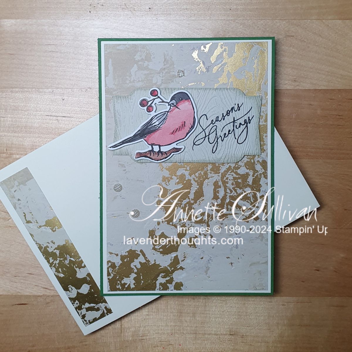 Card 3: The Season of Elegance Specialty DSP creates an elegant background layered onto Basic White and then a Garden Green card base. Die cut a label from the Iconic Imagery Dies, stamp a sentiment and emboss with the Timber 3D Embossing Folder. Add the bird which was die cut from the Nests of Winter DSP with the Winterly Tree Tops Dies.