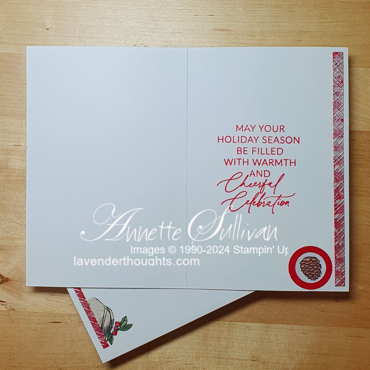 Card 4: Take a piece of Real Red cardstock and add White Pearlized Enamel Effects all over it using a palette knife. Allow to dry and emboss with the Basics 3D Hash Embossing Folder. Attach to a Thick Basic White card base. Use circle punches or dies to cut three Real Red Circles and three images from the Nest of Winter DSP. I used 1″, 1¼”, 1½”, 1¾” and 2″ circle punches. Layer the birds with the red cardstock and attach to the card base using Dimensionals.
