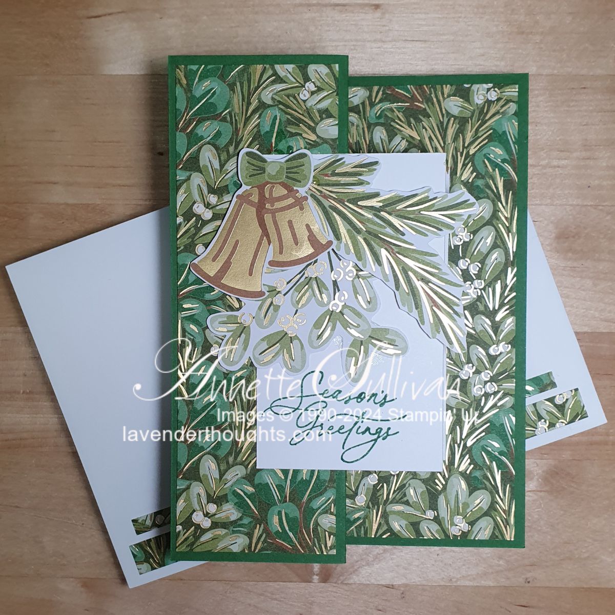 Card 1: This Double Z Fold card has a Garden Green card base with the background layers and die cuts coming from the Season of Green & Gold Specialty DSP.
