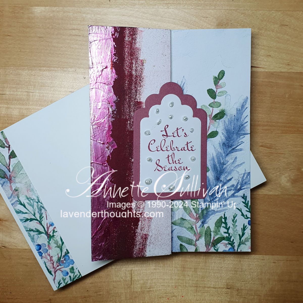 Card 1: This is a standard Z Fold card. Fold the card base in half and then fold the front half back on itself. Add an art panel that is half on the folded back and hanging over the ‘inside’. For this unusual colour, I brayered a layer of Real Red ink and then a layer of Shaded Spruce ink over the top on a Thick Basic White card base.. White Pearlized Enamel Effects were added over the edge. This picked up the hybrid colour and added shine too. The label shapes are from Something Fancy Dies and the sentiment is from Sentimental Wishes. Winter Meadow DSP was used on the right hand panel and the envelope,