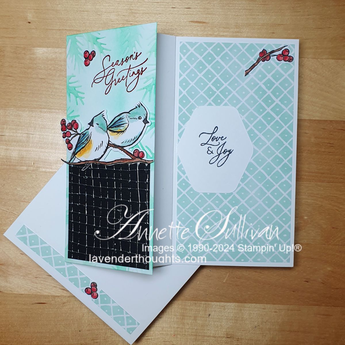 - The background behind the birds was made using the negative branches background die from Winterly Tree Tops with Coastal Cabana ink and a Blending Brush.