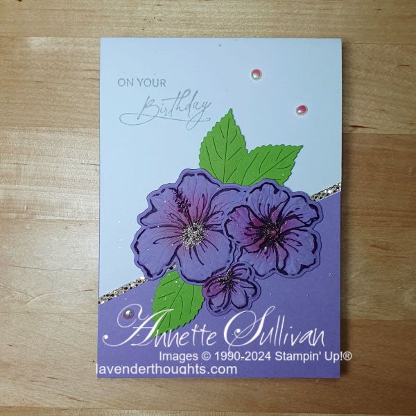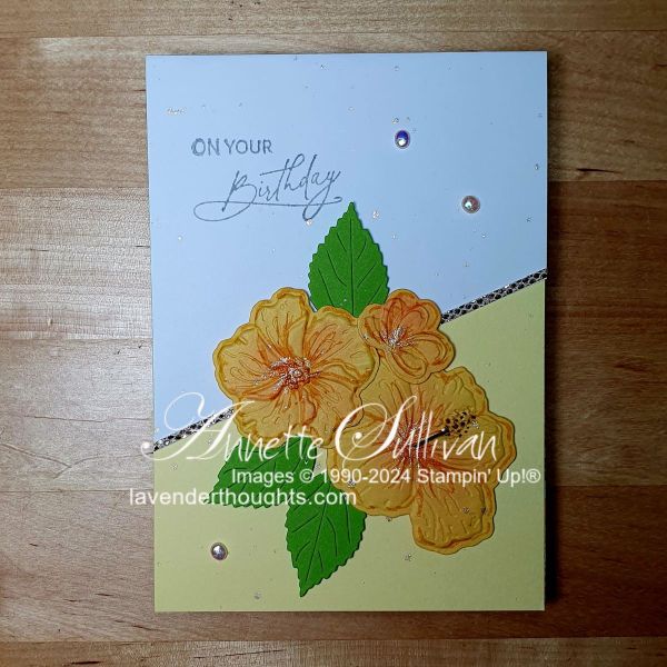 All cards have been made with a Thick Basic White card base, Be Dazzling Specialty Paper, Flat Adhesive Backed Pearls, Wink of Stella, Dimensionals, Happy Hibiscus Stamp Set, Everyday Greetings Stamp Set, Happy Hibiscus Hybrid Embossing Folder and Dies,