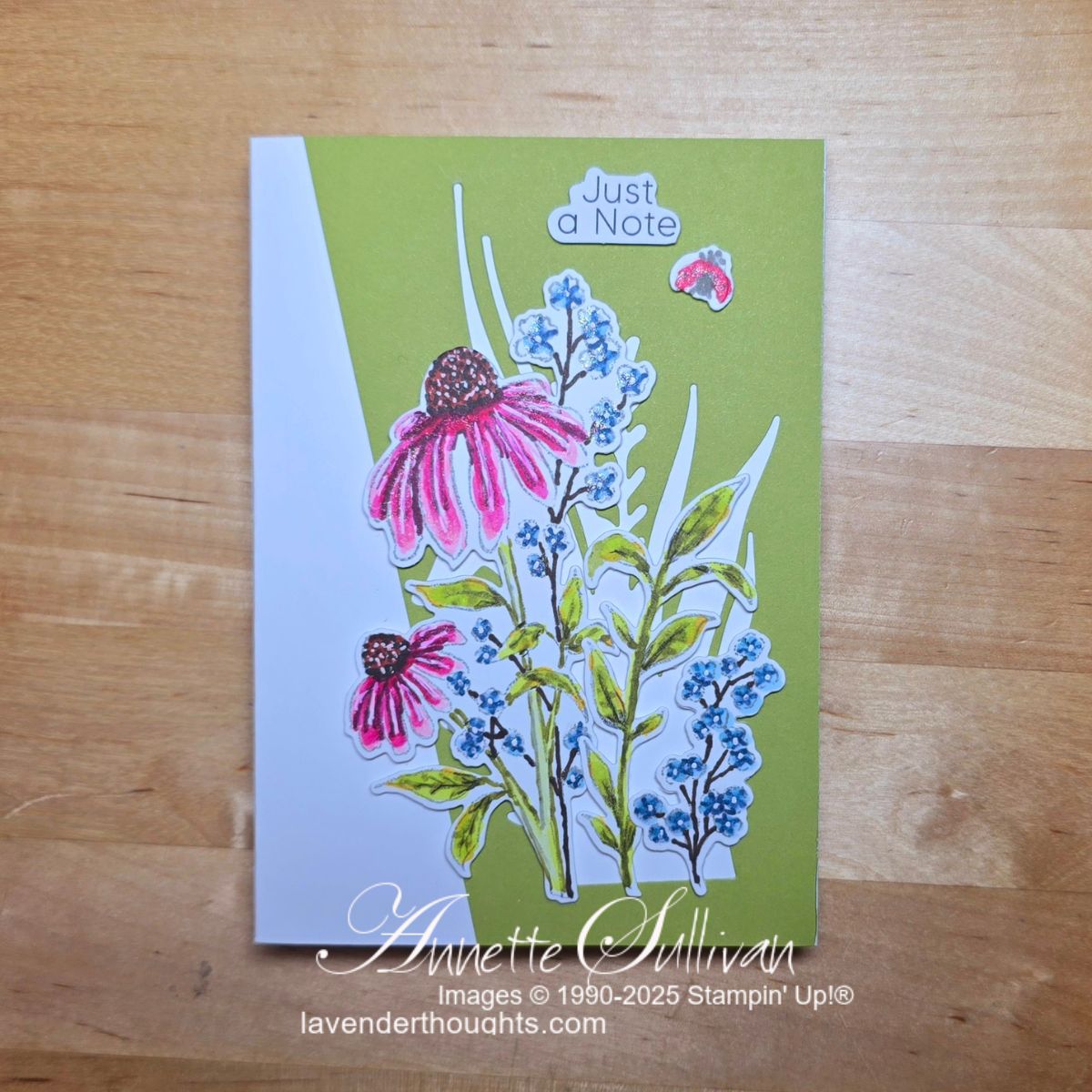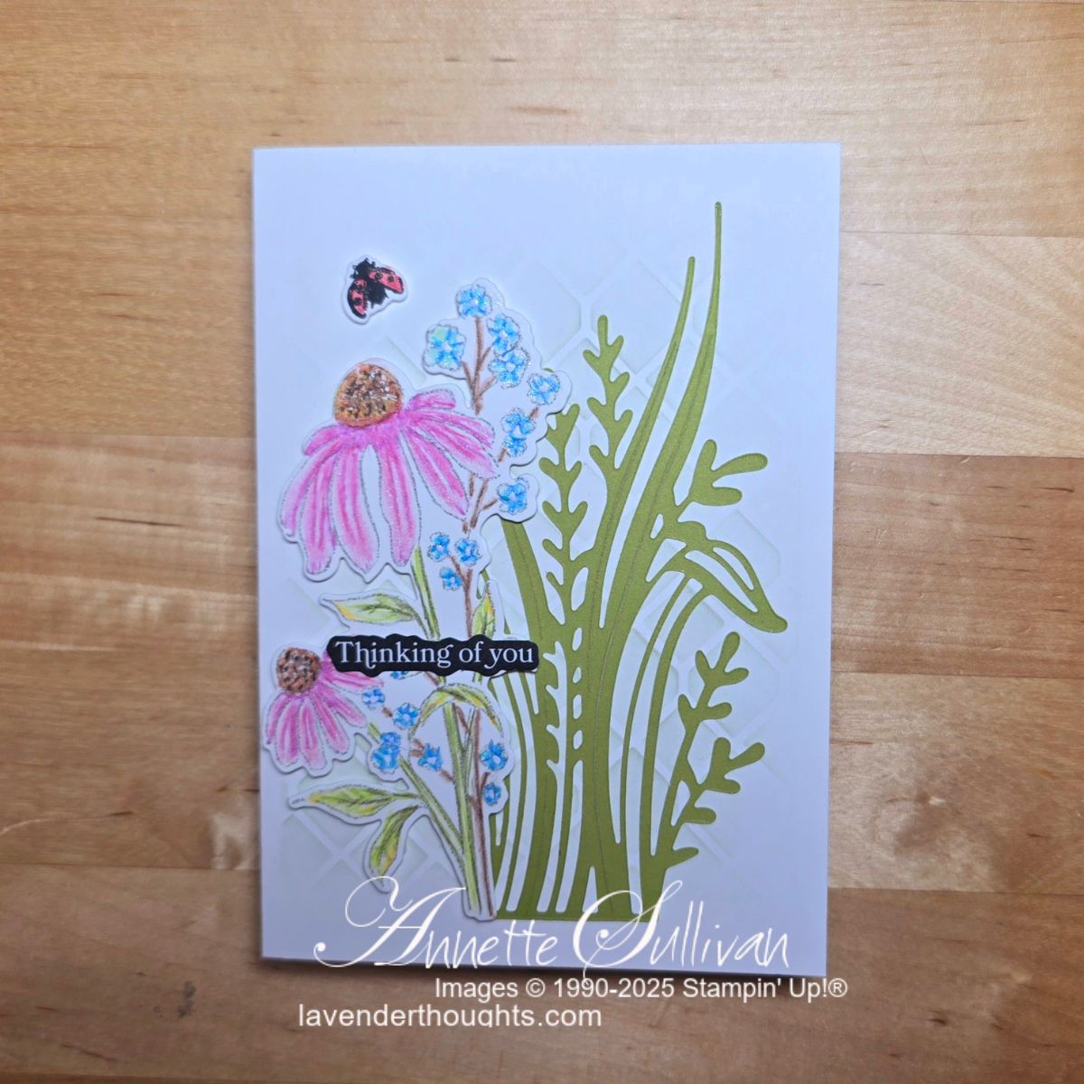 Card 1: For this one I coloured the image with Stampin’ Blends Alcohol Markers. The negative of the leafy image in the background was die cut using the Two Tone Old Olive cardstock. The cute little lady bug was coloured with Poppy Parade Stampin’ Blends. The sentiment is from the Greetings for All Mix & Match Ephemera Pack. I used a White Gel Pen to add some detail to the blue flowers
