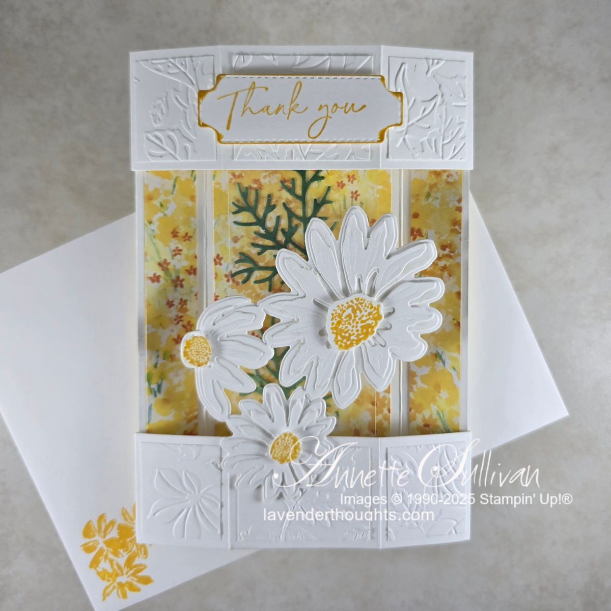 Card 1: This one uses Cheerful Daisies Stamp Set and Dies, Wildflower Designs Stamp Set, Leaf Fall 3D Embossing Folder, Basic White and Crushed Curry Cardstock and Bloom Impressions DSP.