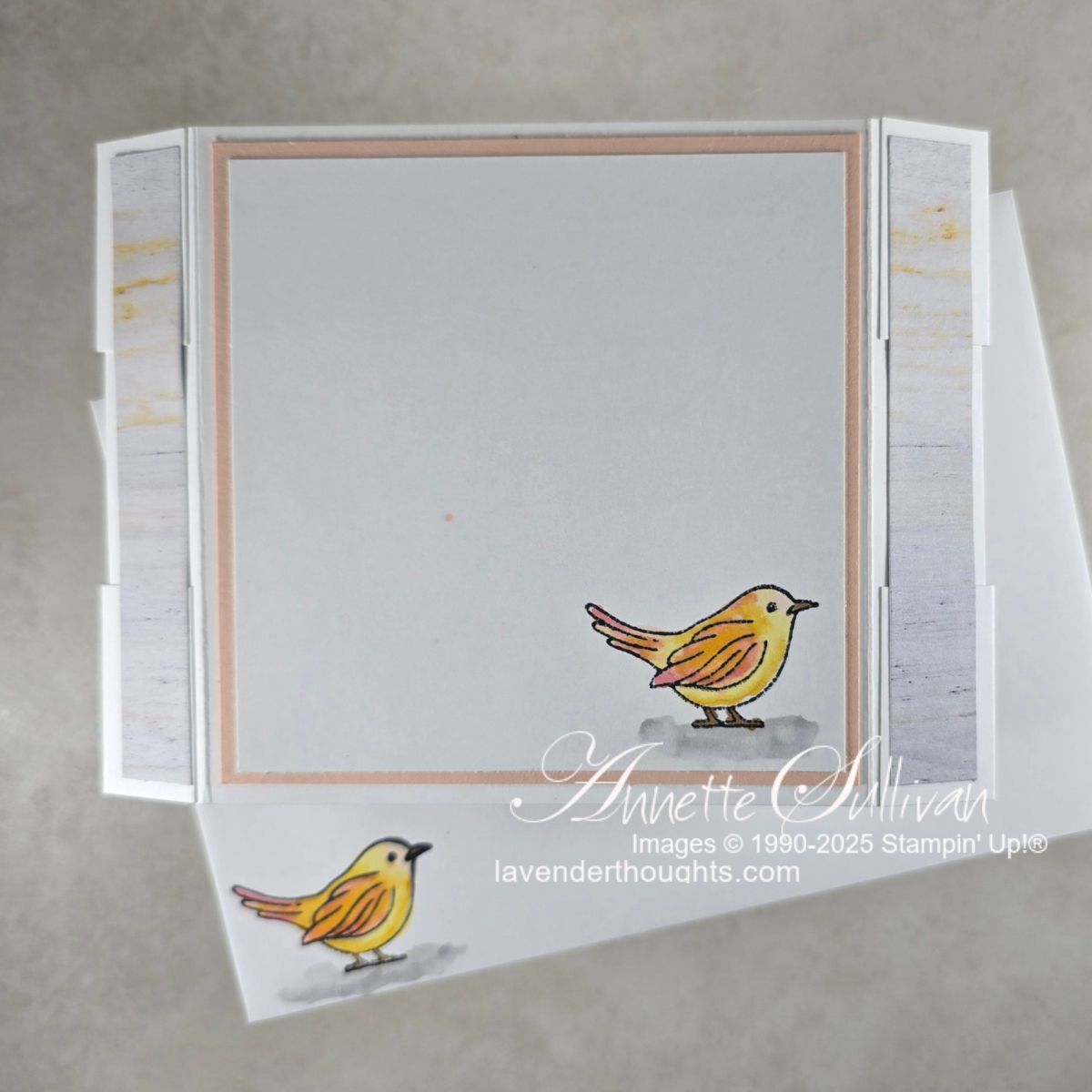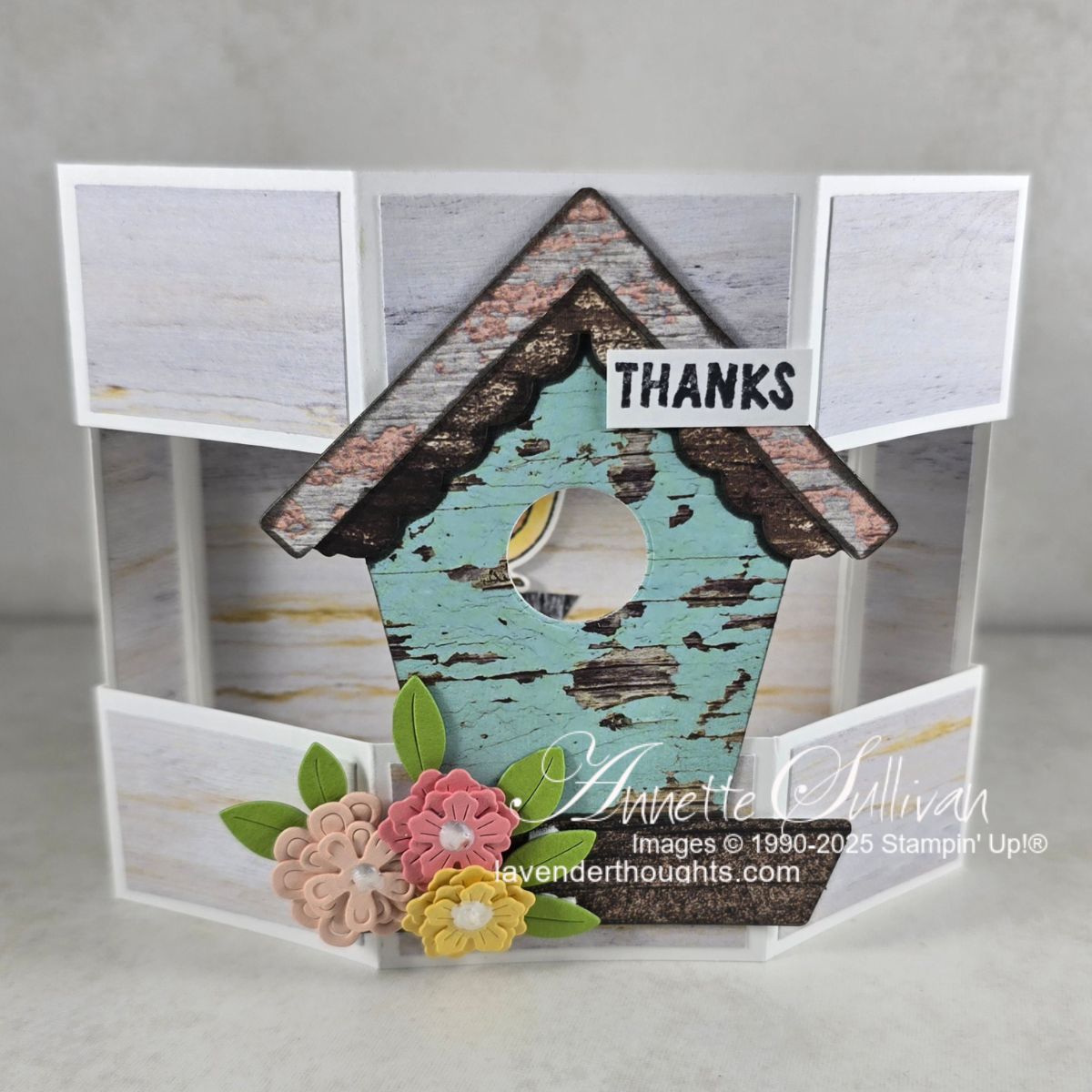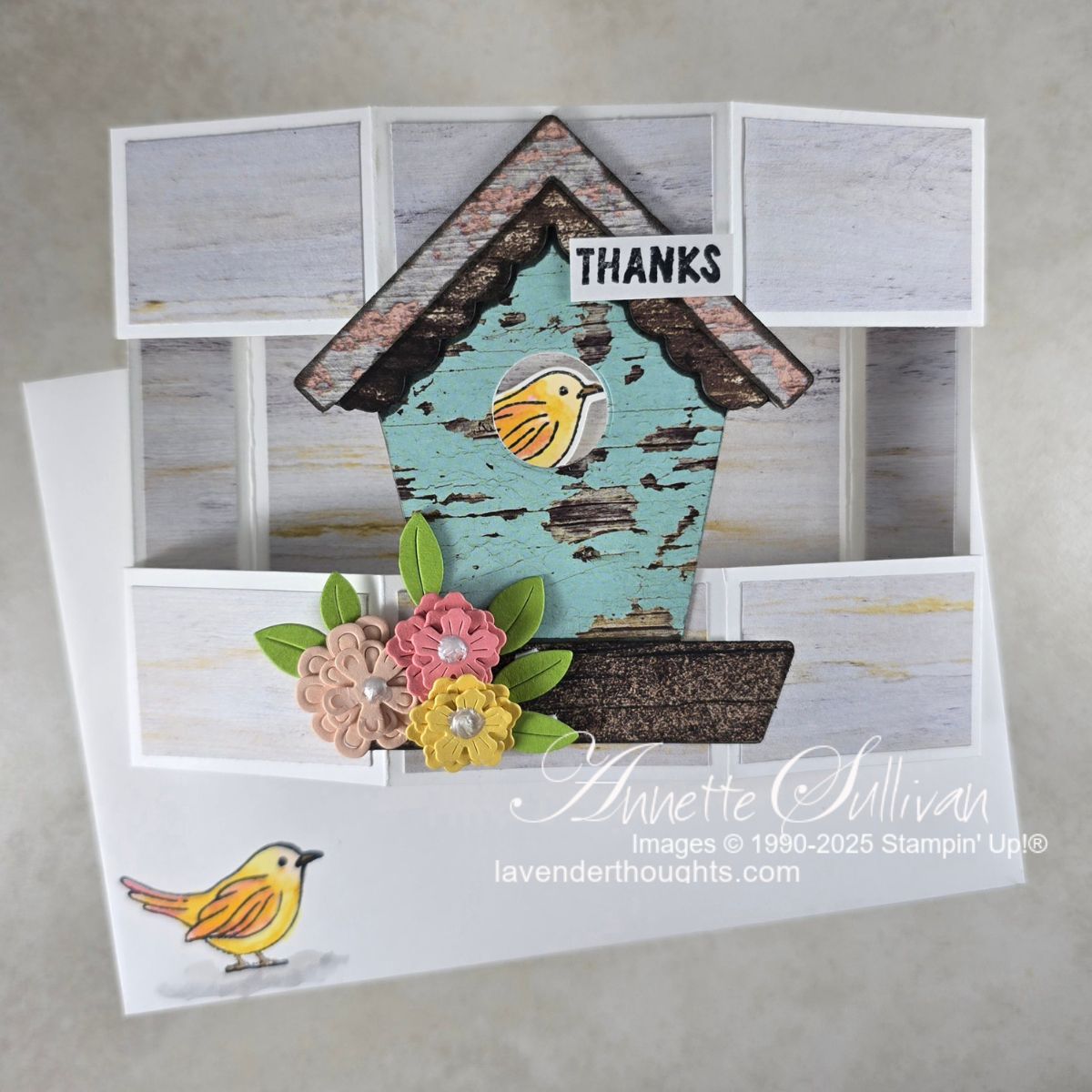 Card 1: This one uses Country Birdhouse Stamp Set and Dies, Memorable Blooms Stamp Set, Basic White, Petal Pink, Flirty Flamingo, Daffodil Delight and Granny Apple Green Cardstock and Country Woods DSP.