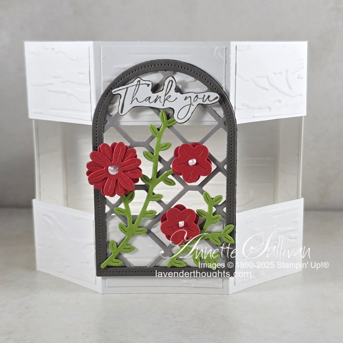 Card 3: This one uses Wildflower Design Stamp Set, Linked Together Dies, Everyday Arches Dies, Basic White, Pebbled Path, Gray Granite, Poppy Parade and Granny Apple Green Cardstock and the Birch Wood 3D Embossing Folder.