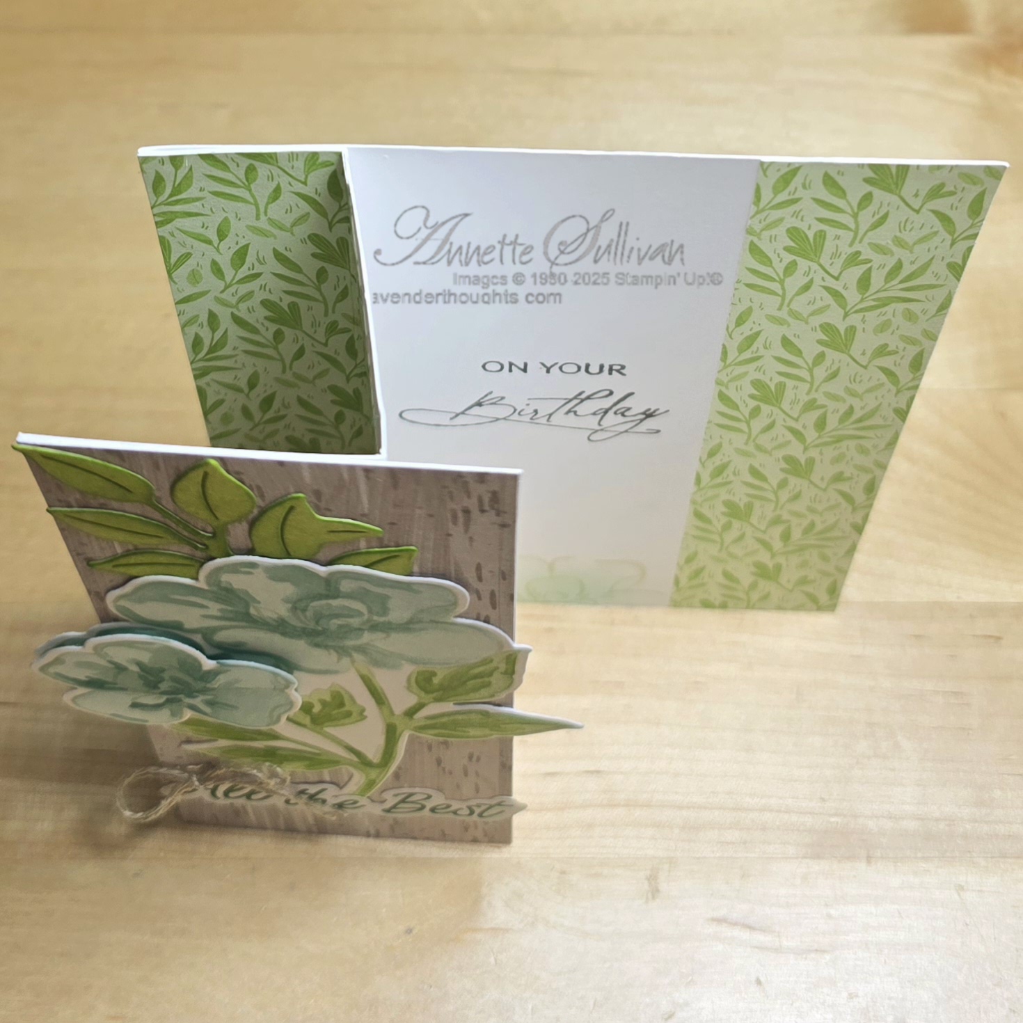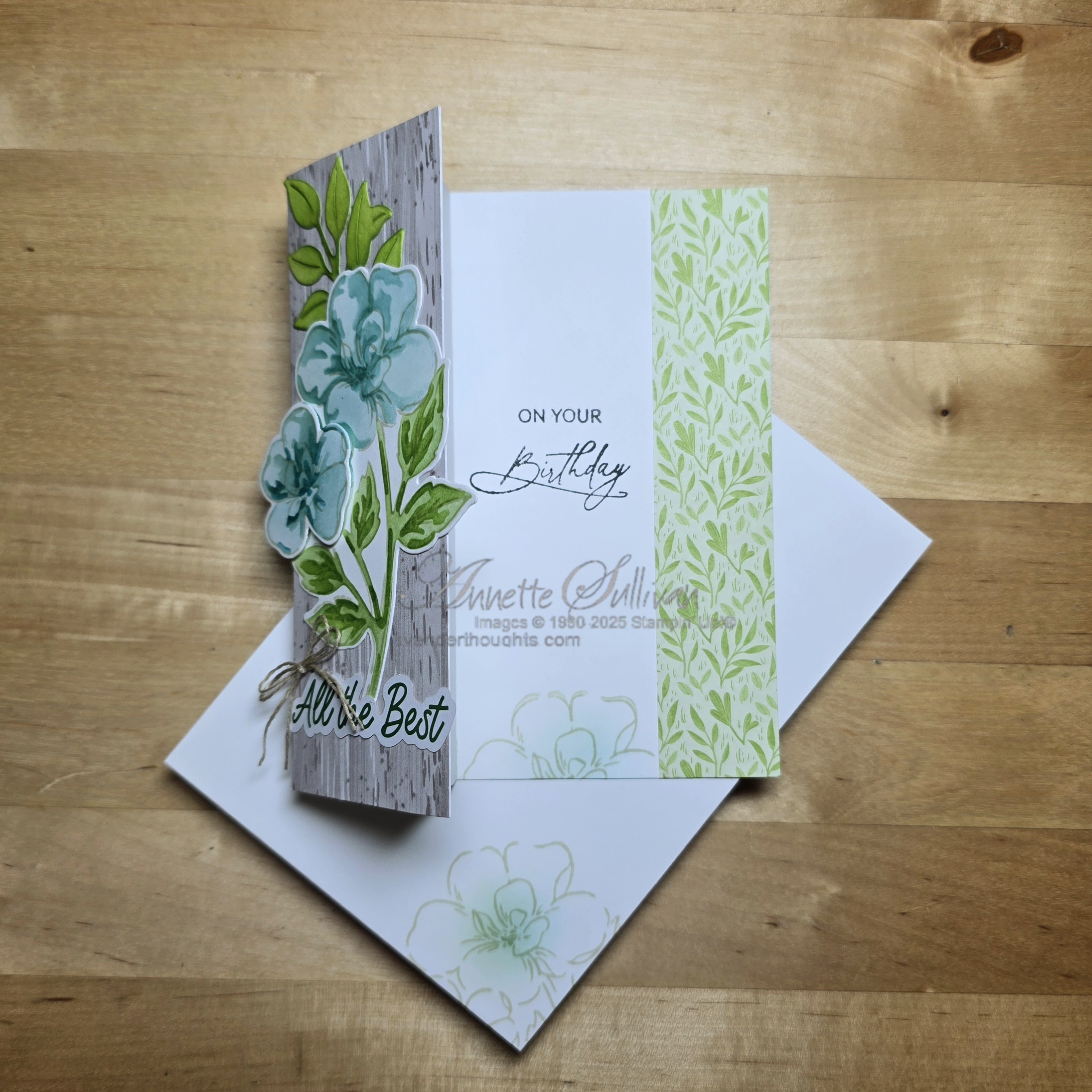 Card 1: This is a Double Decker Z Fold card. It has a Thick Basic White card base with Toadstool Gardens DSP. The image was coloured with Azure Afternoon and Granny Apple Green inks and Blending Brushes. The sentiment on the front is from the Saying Something Ephemera Pack and the one on the inside is from Everyday Greetings. By not stamping the image and just colouring with the masks you get a very soft look.