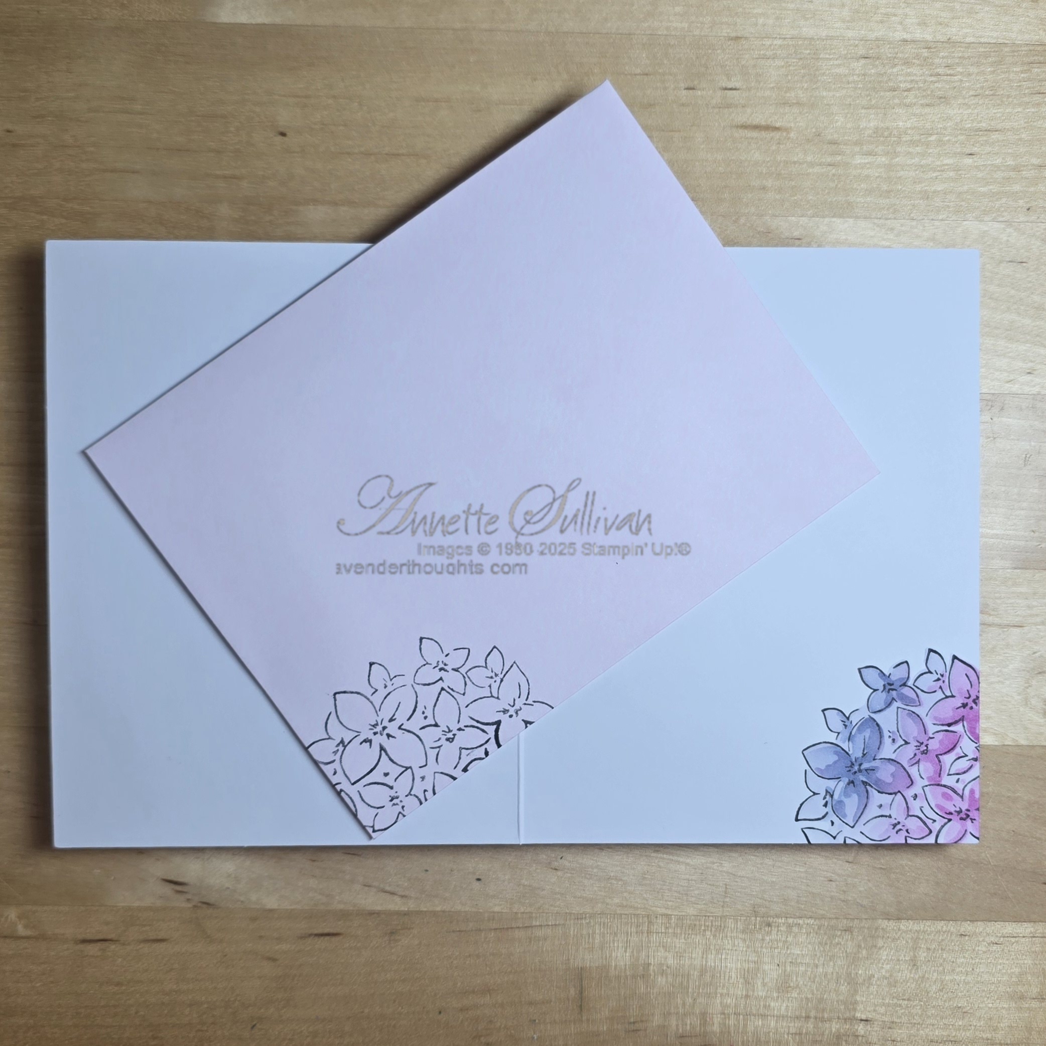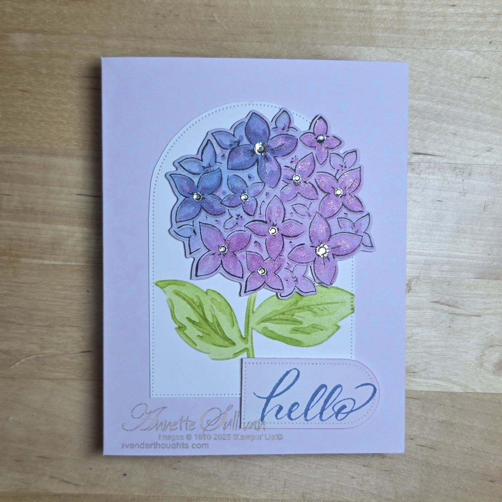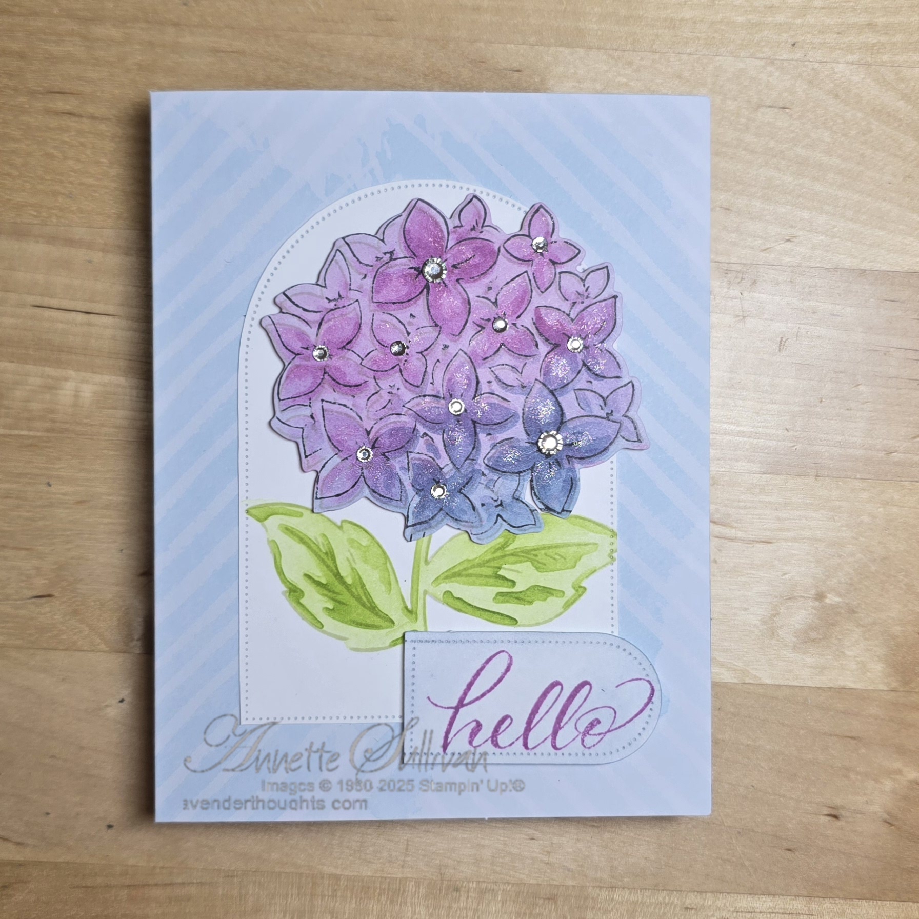 Cards 2 and 3: The card bases for these two are from the Stripes & Florals Mix & Match Cards & Envelopes. The leaves were coloured with Lemon Lime Twist and Granny Apple Green inks and Blending Brushes on a Basic White layer which was then die cut with one of the Everyday Arches Dies. The hydrangea flowers were stamped with Memento Tuxedo Black ink on Beautiful Bokeh DSP and coloured with Petunia Pop and Boho Blue inks and Blending Brushes. They were then die cut and attached to the arch die cut with Dimensionals. Rhinestone Basic Jewels were added into the centre of each petal. The sentiment from Layering Leaves was stamped on Basic White, die cut with an Everyday Arches die and lightly coloured with the matching inks.