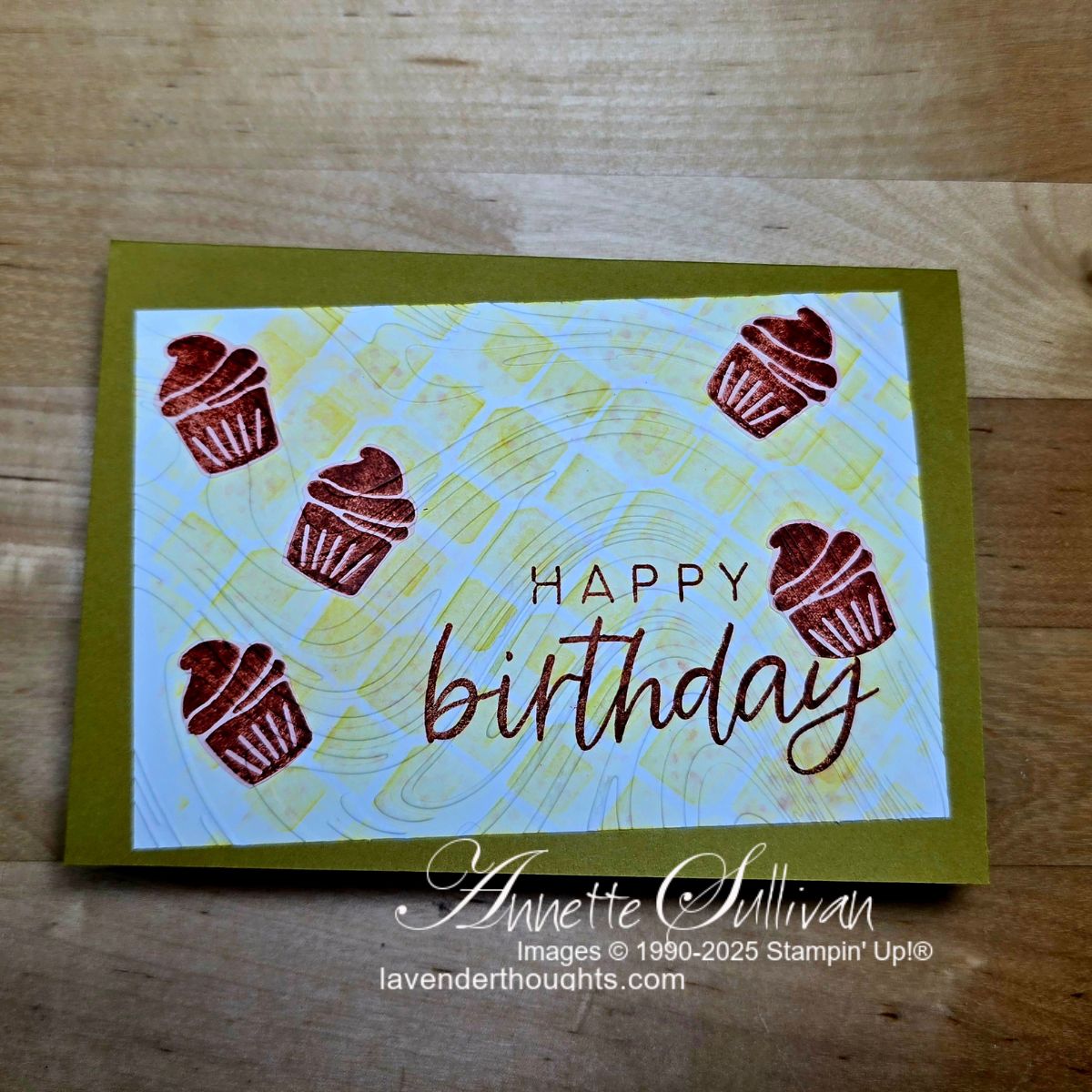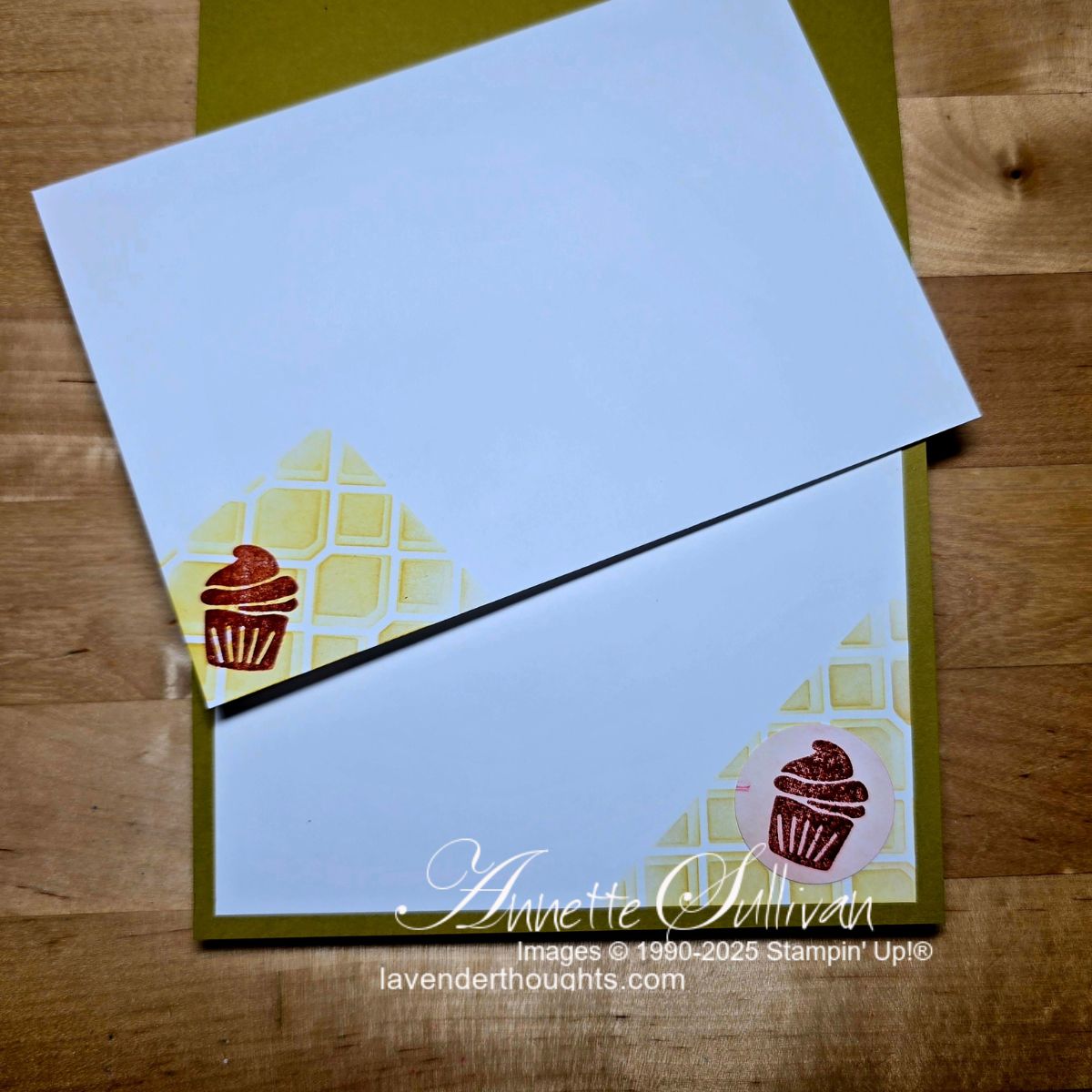 Cards 5 and 6: These cards use the Linked Together Bundle. The first card uses the dies with a sentiment from Poised Peony. The card base is Old Olive with a layer of Wood Textured Specialty paper. The second card uses the Decorative Masks with Crushed Curry ink on Basic White cardstock. This layer was then stamped with a sentiment from With You in Mind in Cajun Craze ink. Some cupcakes from the same stamp set were stamped with Cajun Craze ink, fussy cut and attached to the masked layer. It was then embossed with the So Swirly Embossing Folder and attached to a Wild Wheat card base.