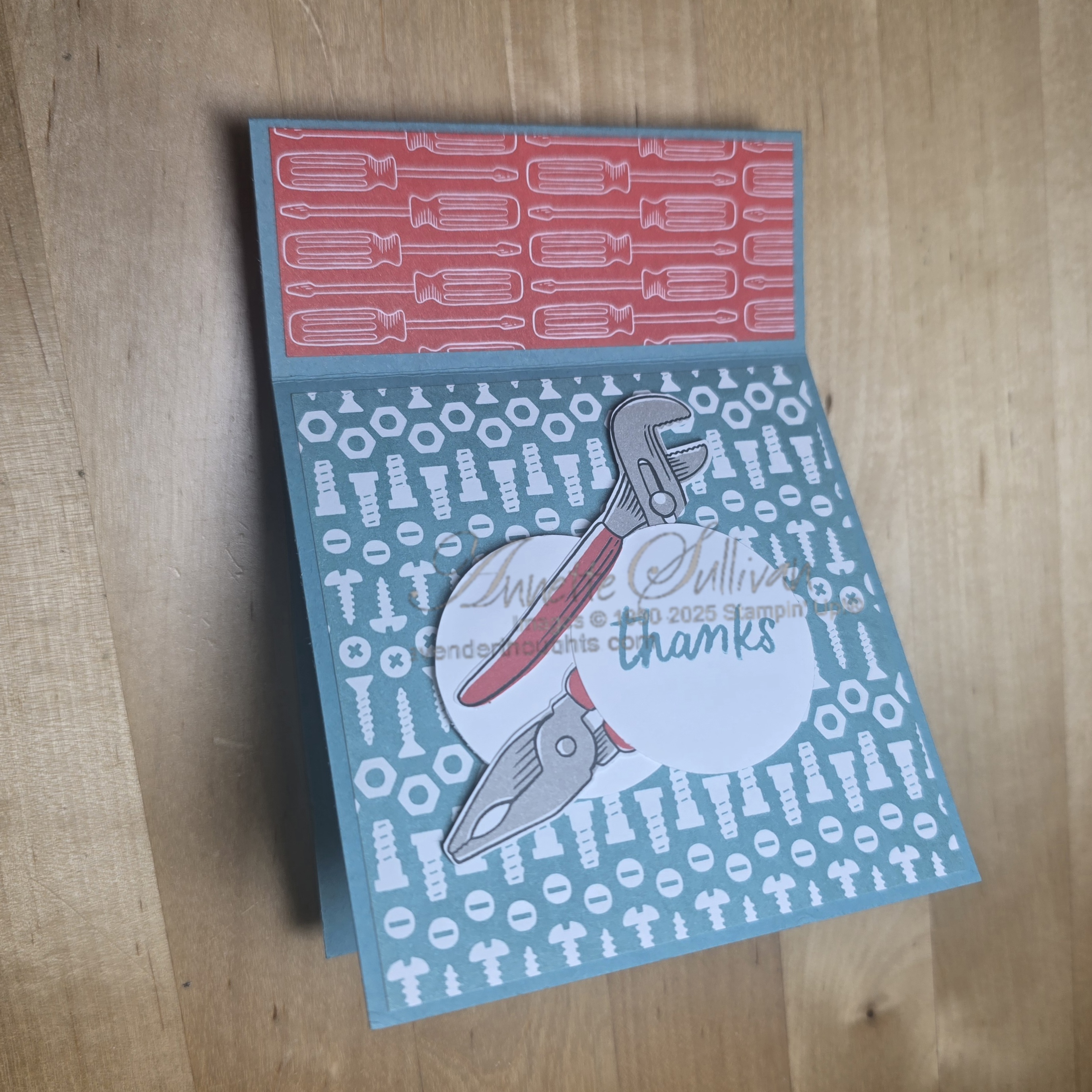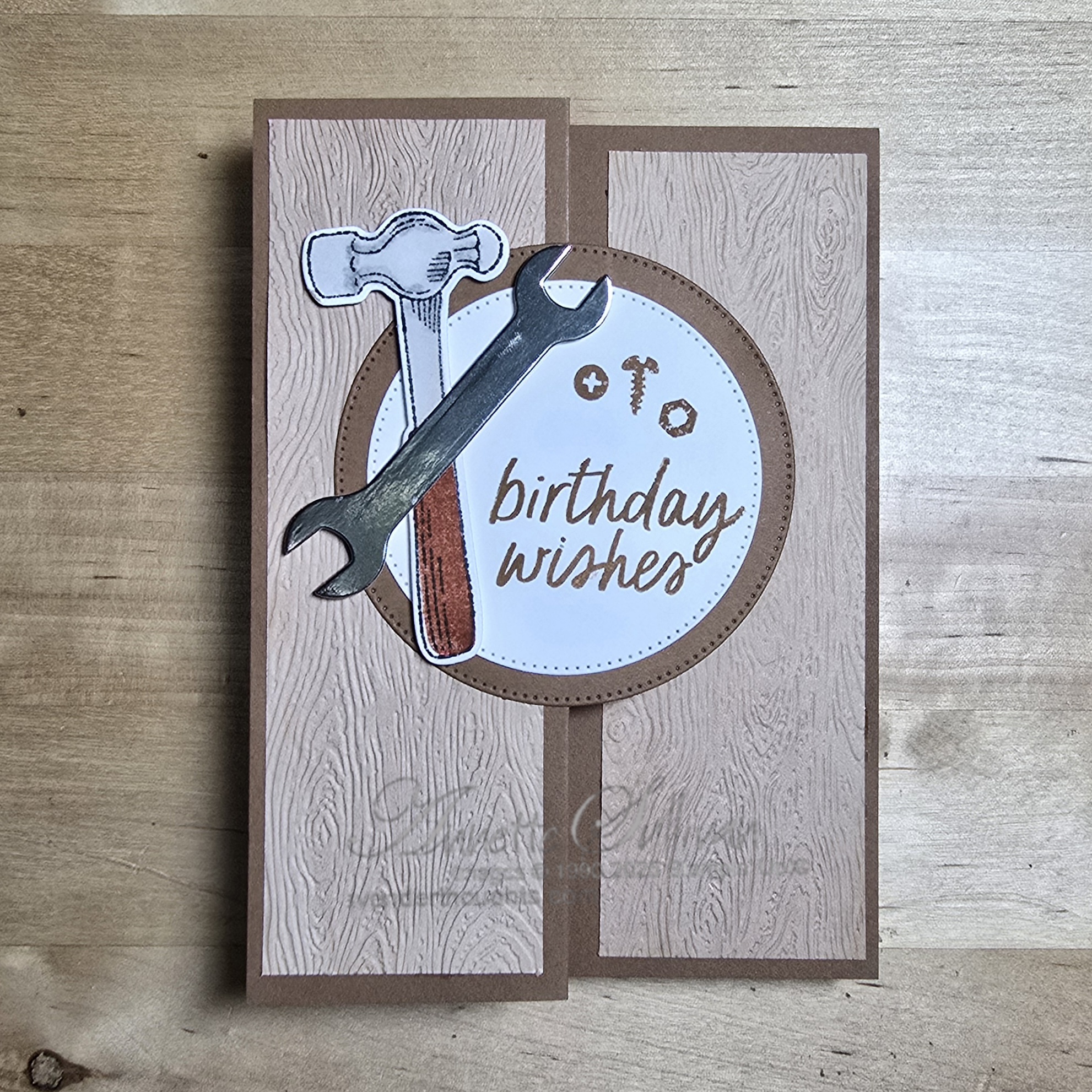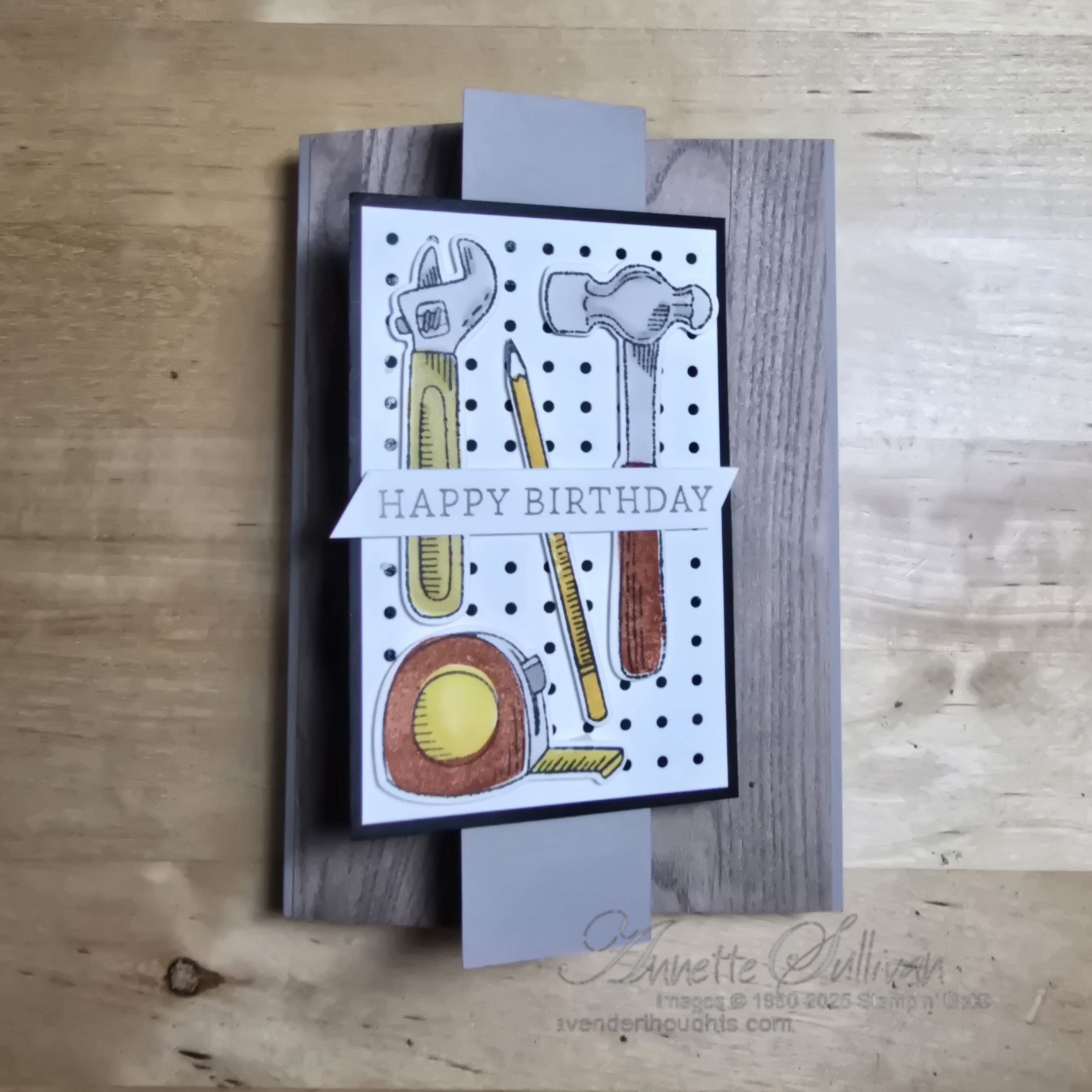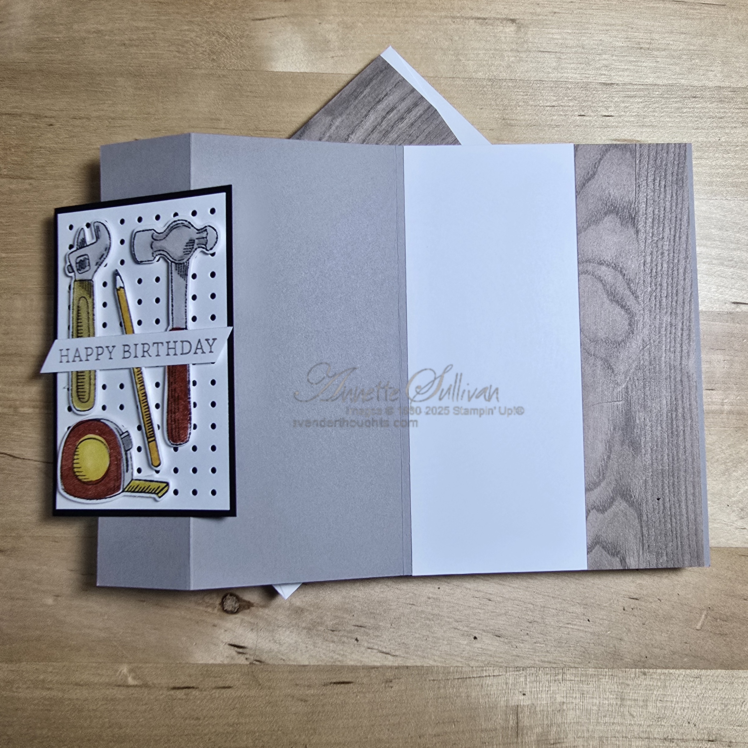 Card 2: This Z Fold holds a peg board full of tools – all stamped and die cut. The card base is Gray Granite with retired Wood Textures DSP. Fold a standard card base in half and then fold back a piece 3.5cm (1¼”).