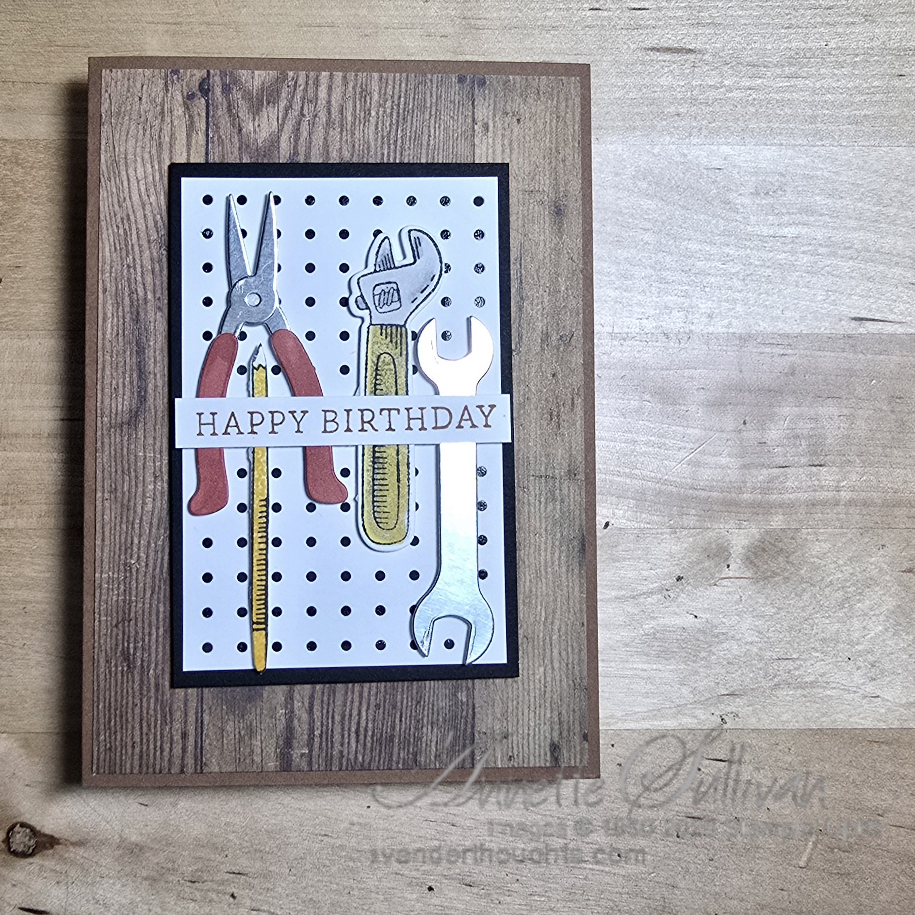 Card 4: Another peg board full of tools. This one is mounted on a standard Pecan Pie card base with the retired Wood Textures DSP.