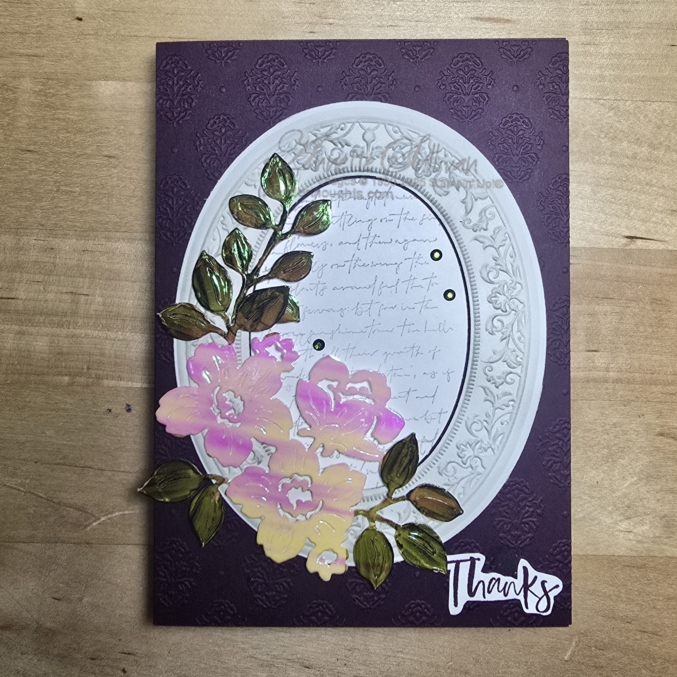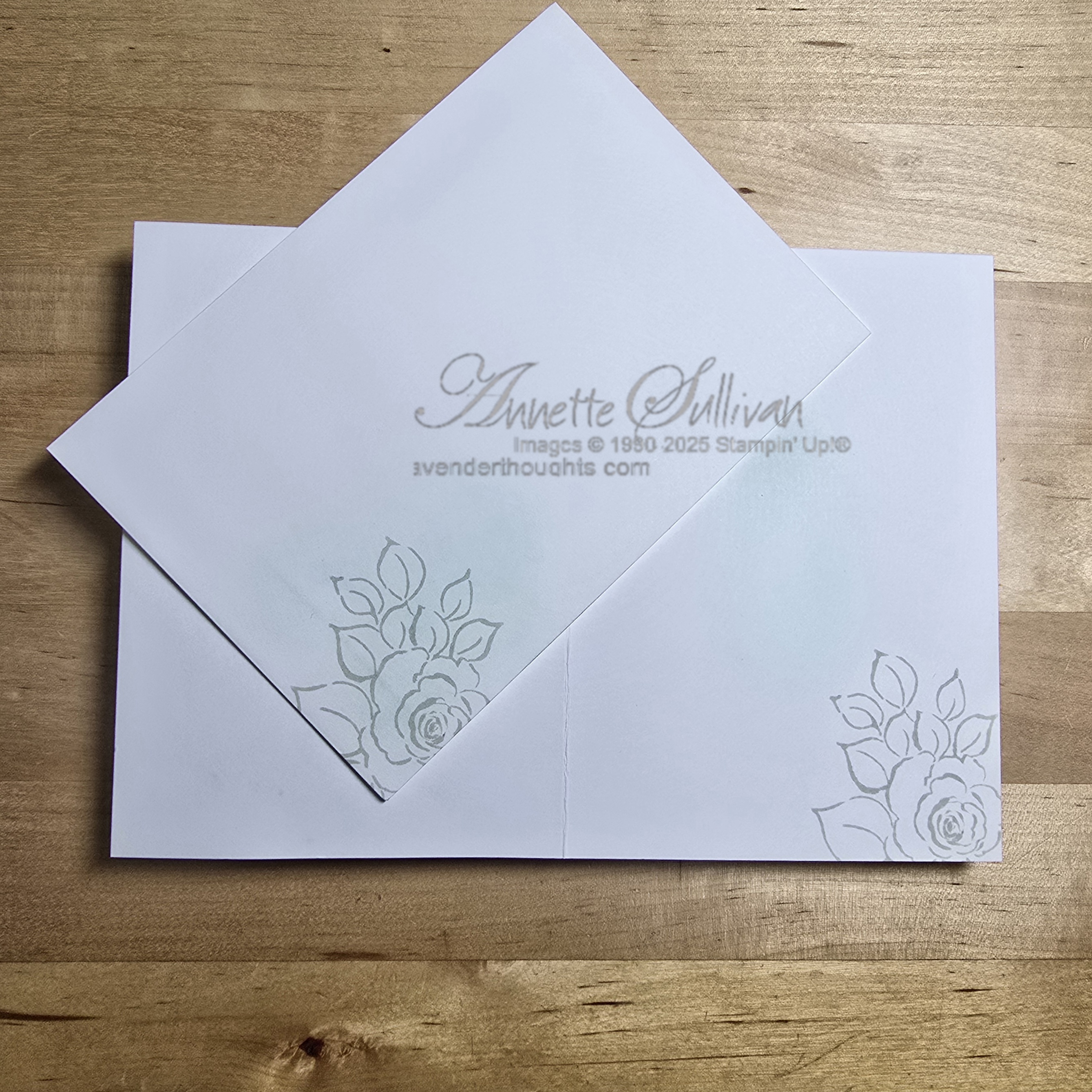 Card 5: A vintage look here using the retired Heirloom Frames 3D EF and matching Heirloom oval die. The stand alone die cut image has a bit of a twist. A piece of an Iridescent Treat Bag was attached to Basic White cardstock with Adhesive Sheets before die cutting the floral image and the leaf image. The flowers were left with the iridescent colour and the leaves were coloured with the Mossy Meadow Stampin’ Blends. The iridescence shines through the green so that the whole image is sparkling. The background layer was embossed with the Damask Designs EF as was the flap of the envelope and a small part at the base of the inside layer. The embossed oval was highlighted using Blending Brushes and Smoky Slate ink and attached with Dimensionals. The inner oval was stamped with an Elements of Text image.