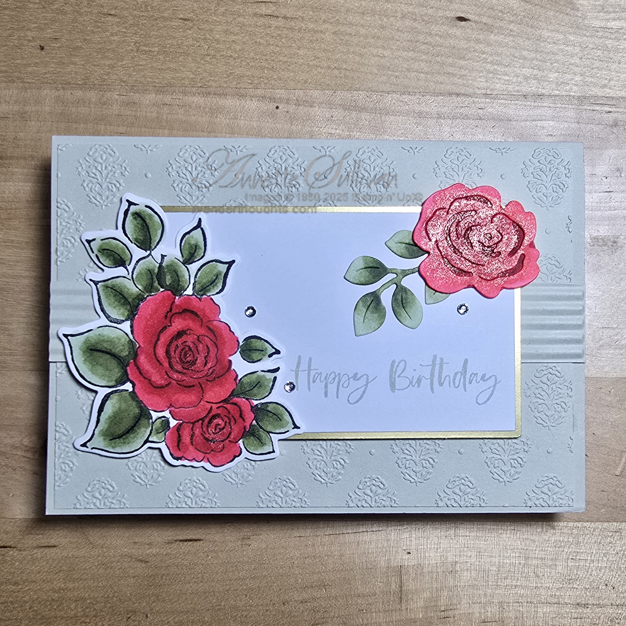 Card 1: The image on the left was stamped, coloured with Stampin’ Blends alcohol markers (Real Red, Poppy Parade, Mossy Meadow and Soft Sea Foam) and die cut. The leaves and rose on the right are die cut images (not stamped). These were also coloured with the Stampin’ Blends. The card base of Basic Beige has two layers of embossing – the first is a full layer using the Damask Designs Embossing Folder and then there is a strip embossed with the Mini Corrugated 3D Embossing Folder. The flowers covered in Wink of Stella were layered onto one of the Touch of Gold Tags and some Rhinestones were added for extra sparkle.