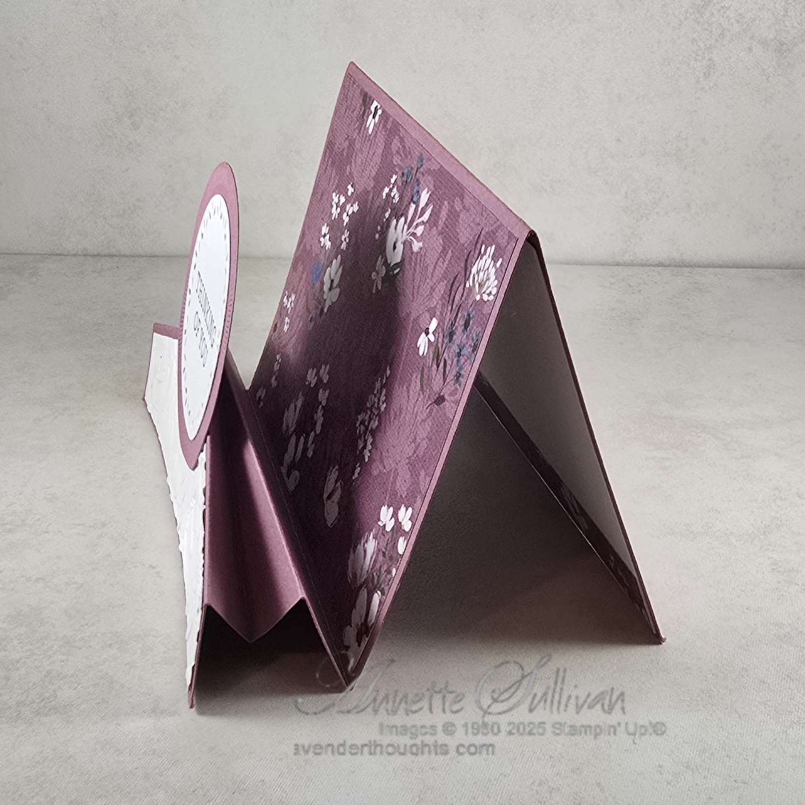 Card 2: This one is 14.8cm x 10.5cm (get two from a piece of A4) and uses Moody Mauve and Basic White cardstock with Wildly Flowering DSP.