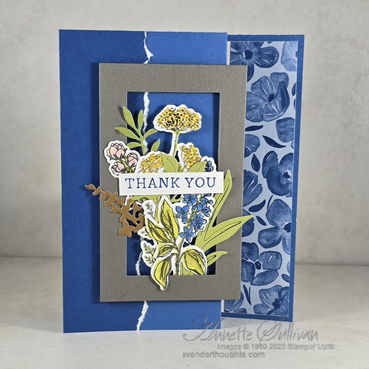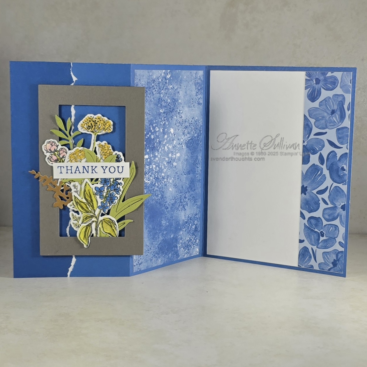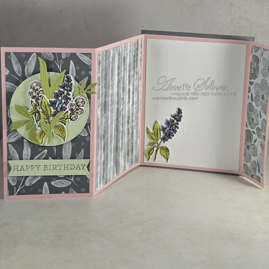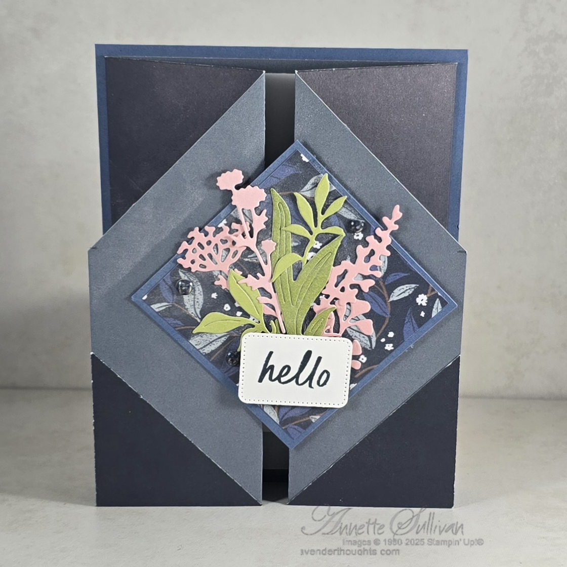 Card 1: This Double Gate Fold uses Secret Sea, Old Olive and Pretty in Pink two tone cardstock with a Misty Moonlight card base and Peaceful Garden DSP. The images are from the Gallery Blooms Dies. The sentiment is from Simply Said.