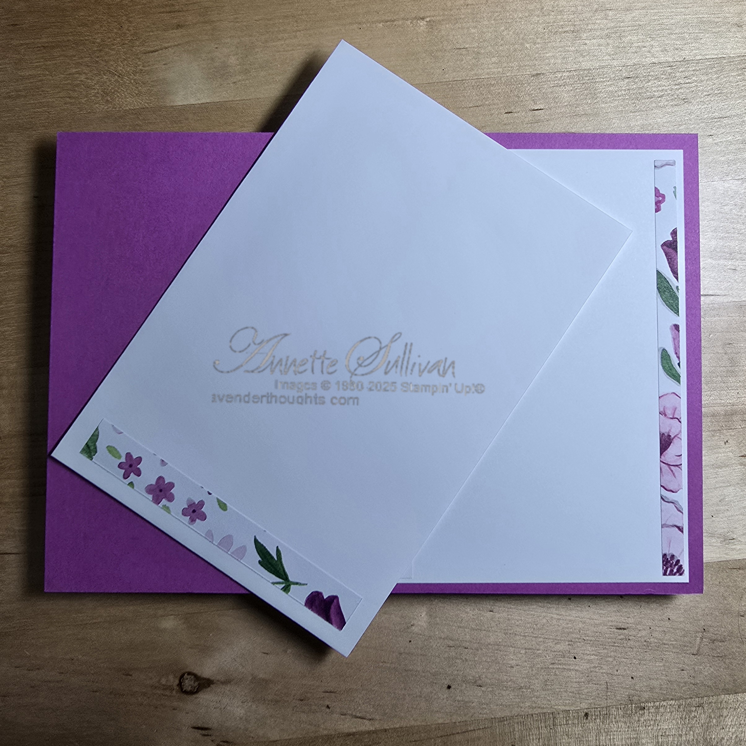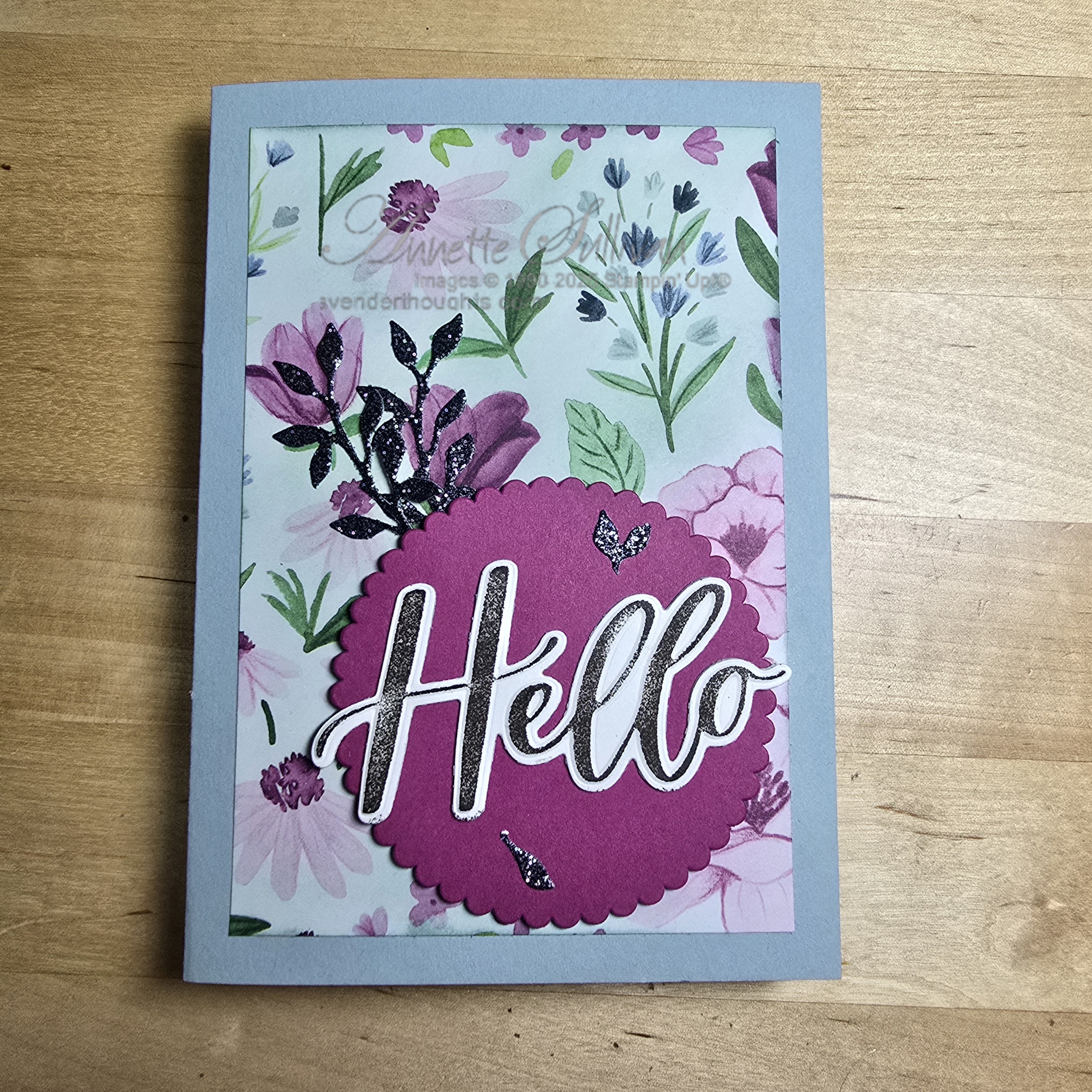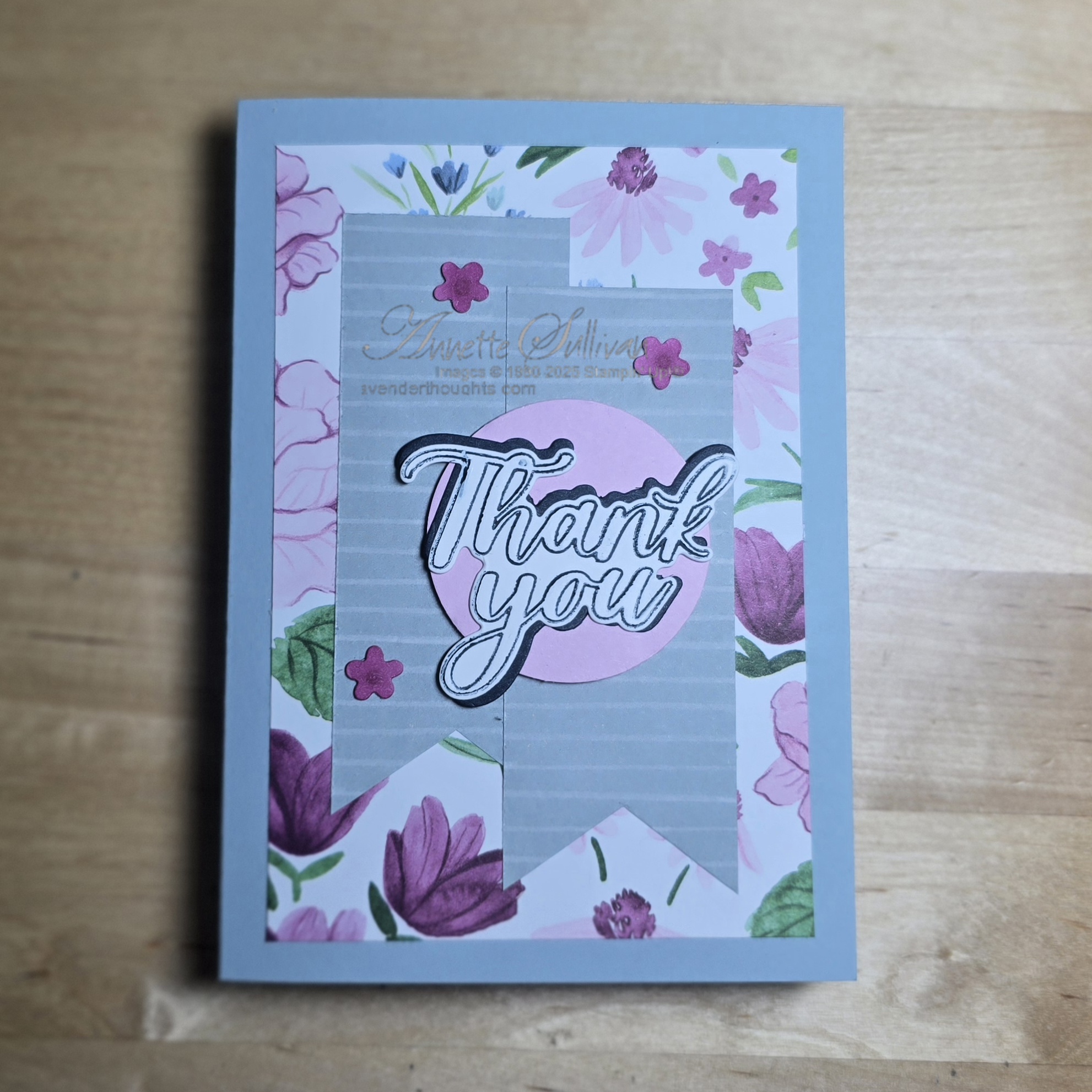 Card 4: In the catalogue sample a large die was used on the DSP to create interest. The DSP that I used didn’t really work to do that so I just used a piece as well as some strips of the Peaceful Garden Glimmer Paper. The card base is Petunia Pop and the sentiment is from the Thoughtful Moments Hybrid Embossing Folder and Dies.
