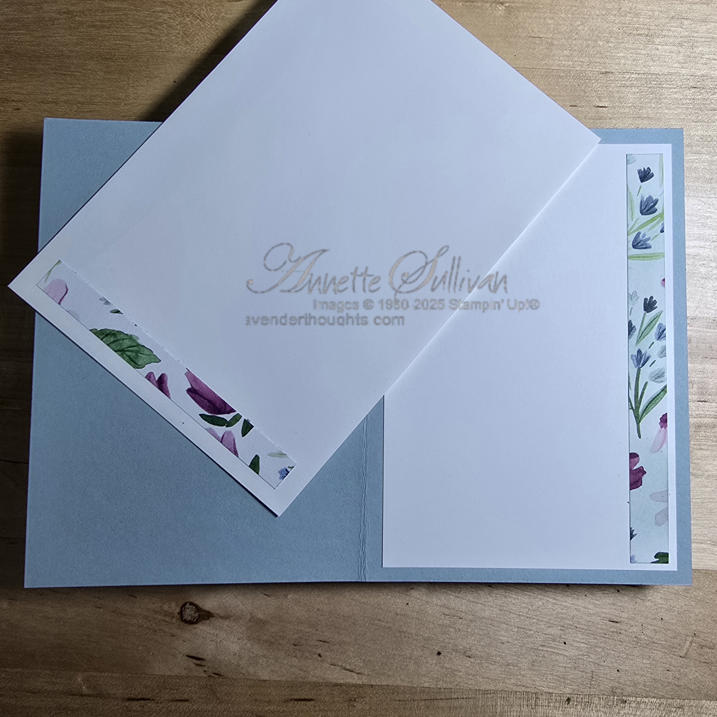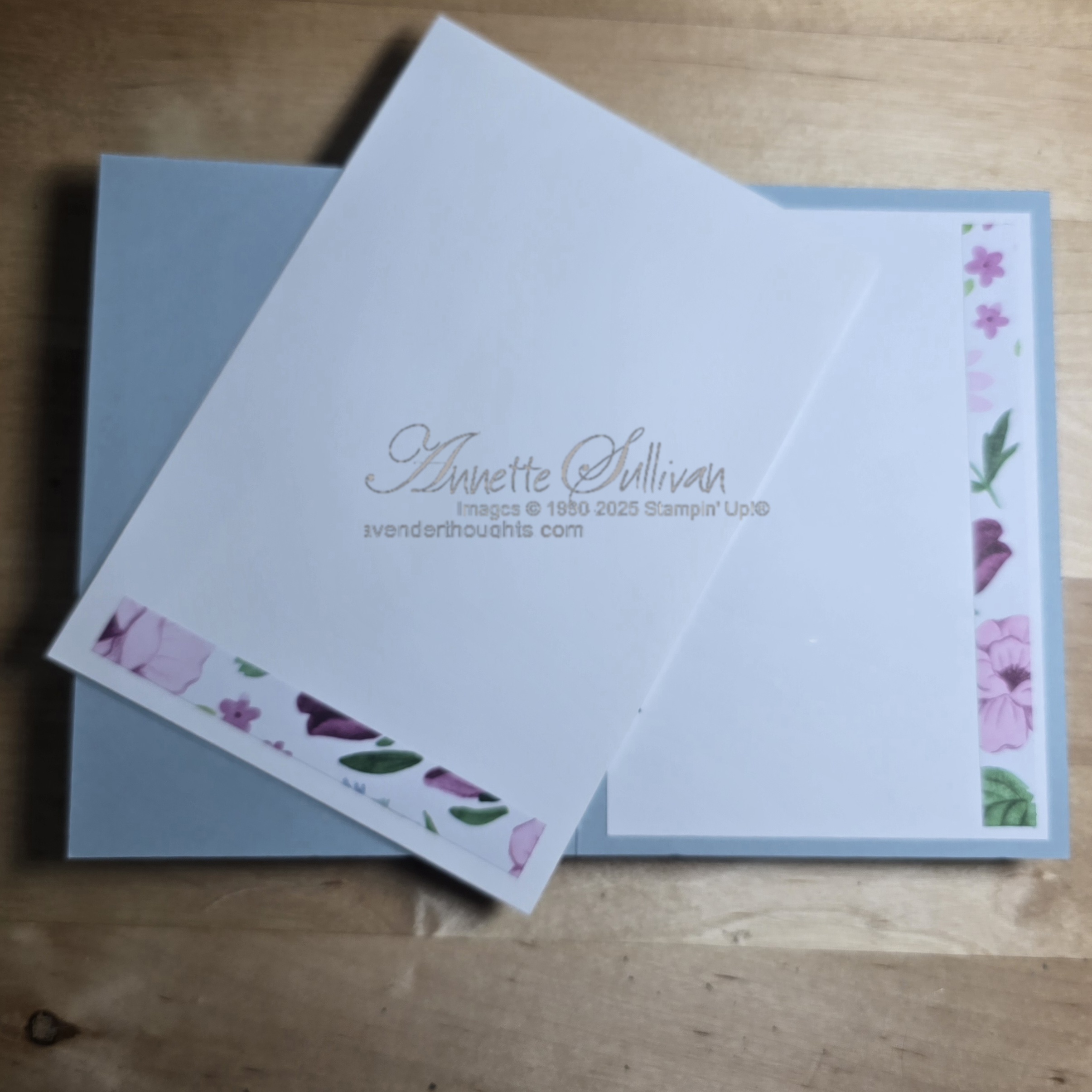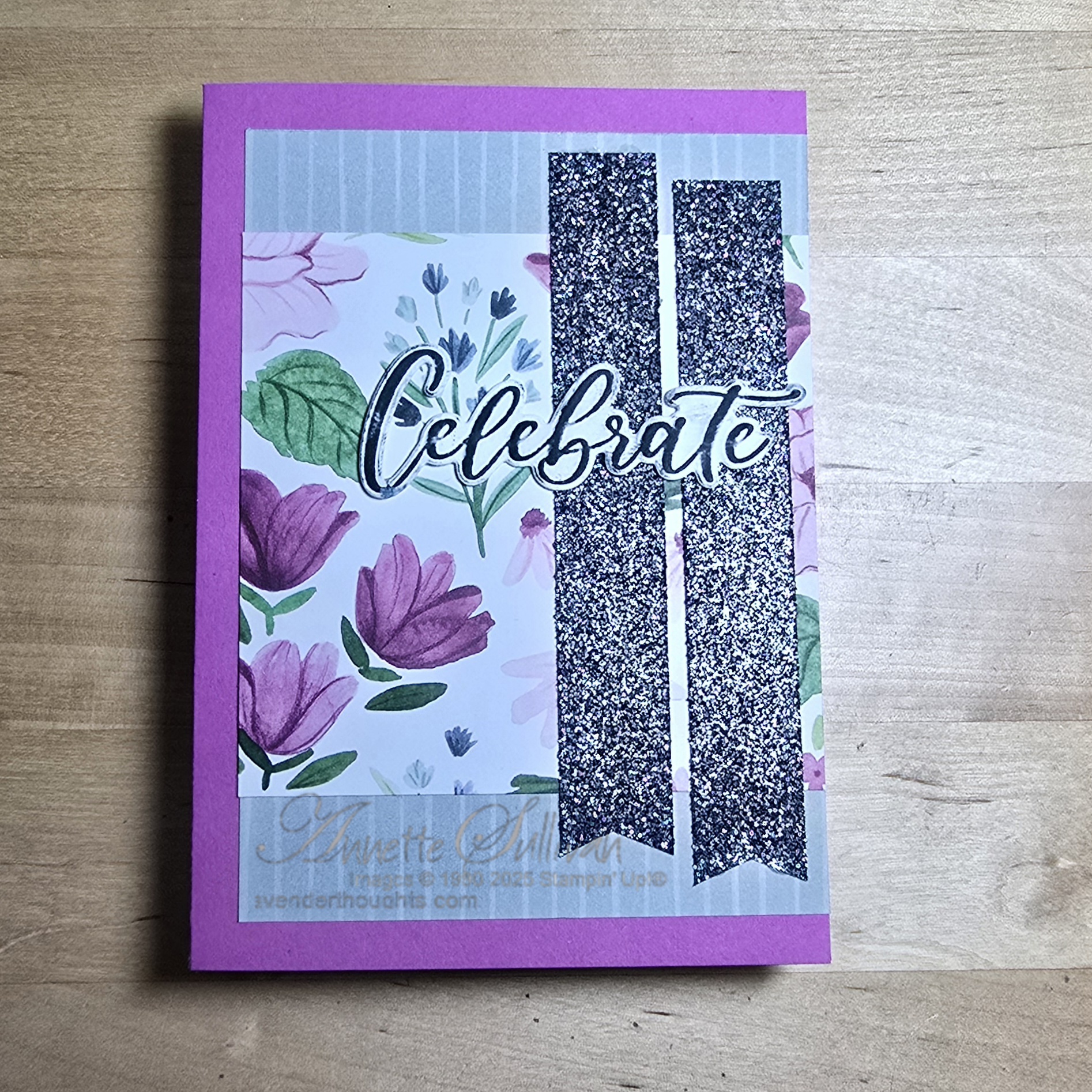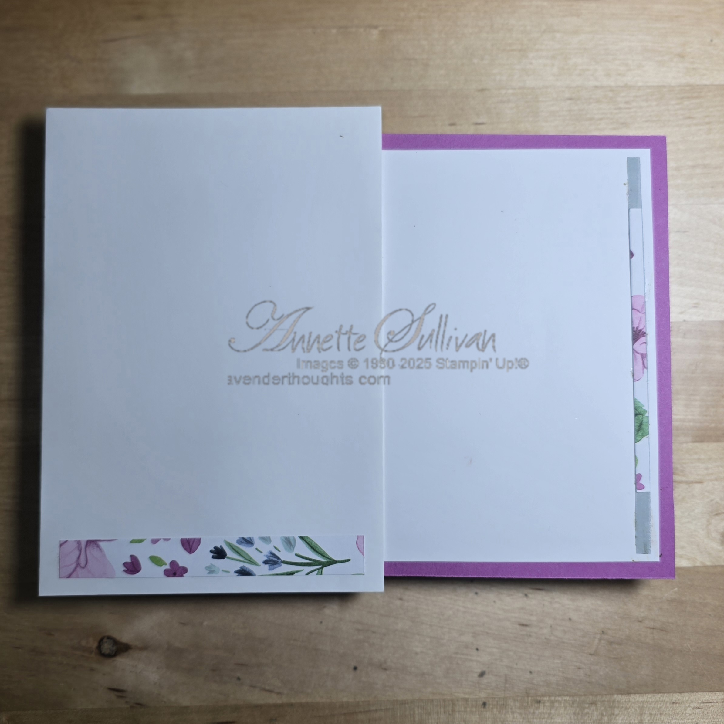 Card 4: In the catalogue sample a large die was used on the DSP to create interest. The DSP that I used didn’t really work to do that so I just used a piece as well as some strips of the Peaceful Garden Glimmer Paper. The card base is Petunia Pop and the sentiment is from the Thoughtful Moments Hybrid Embossing Folder and Dies.
