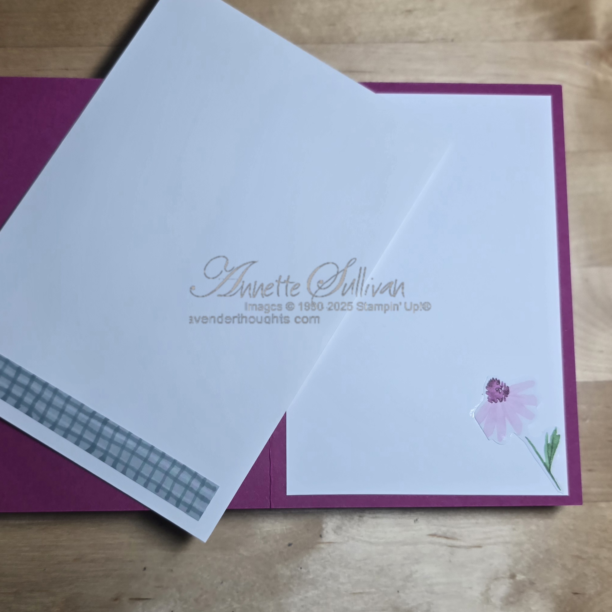 Card 6: Dressing up the pattern of the DSP was the theme for this one. I added a plaid effect to the striped piece of Cloud Cover DSP with matching Stampin’ Blends. To add to the texture I embossed the Berry Burst card base with the Forever Plaid 3D Embossing Folder. The banner panel is Peaceful Garden Glimmer Paper and the sentiment is from Itty Bitty Greetings.