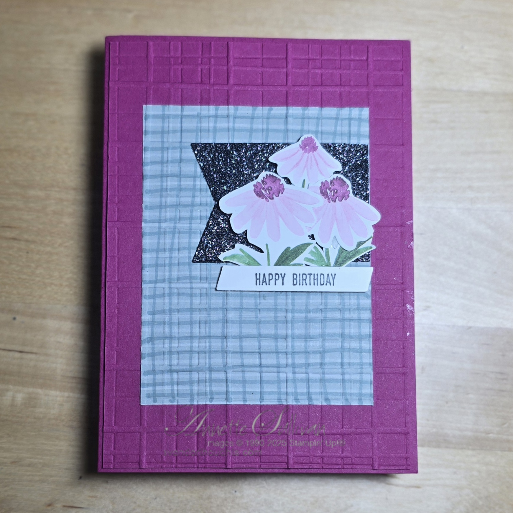 Card 2: Stampin’ Blends alcohol markers were used to colour some of the images on the DSP. For my take, I have added outlines around some of the flowers and leaves as there was enough colour already in the DSP. The card base is Petunia Pop and the sentiment layer is Berry Burst. The sentiment is from Country Birdhouse.