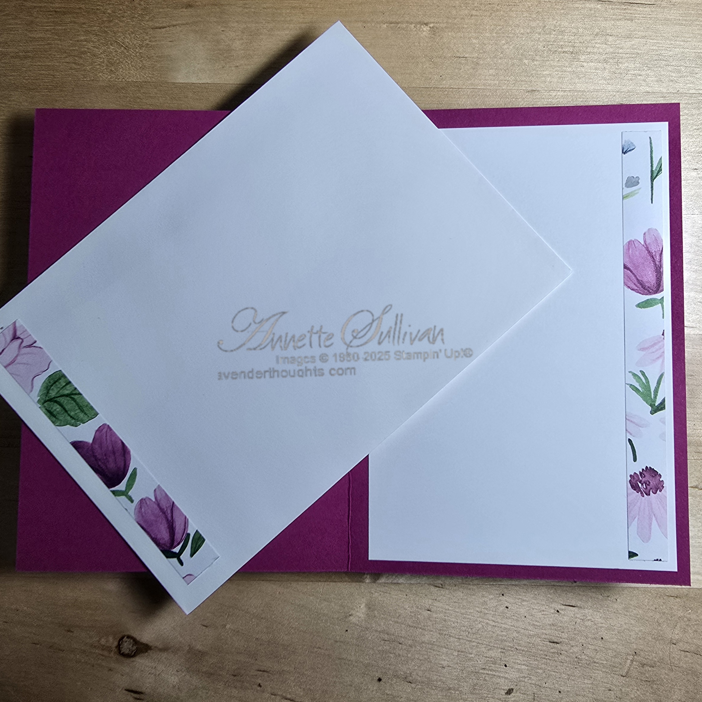 On page 42 on the 2025 September-December Mini Catalogue there is a template and sample ideas for using a One Sheet Wonder. This is the template and I have used it today with a sheet of the Florals in Bloom DSP to create six cards.