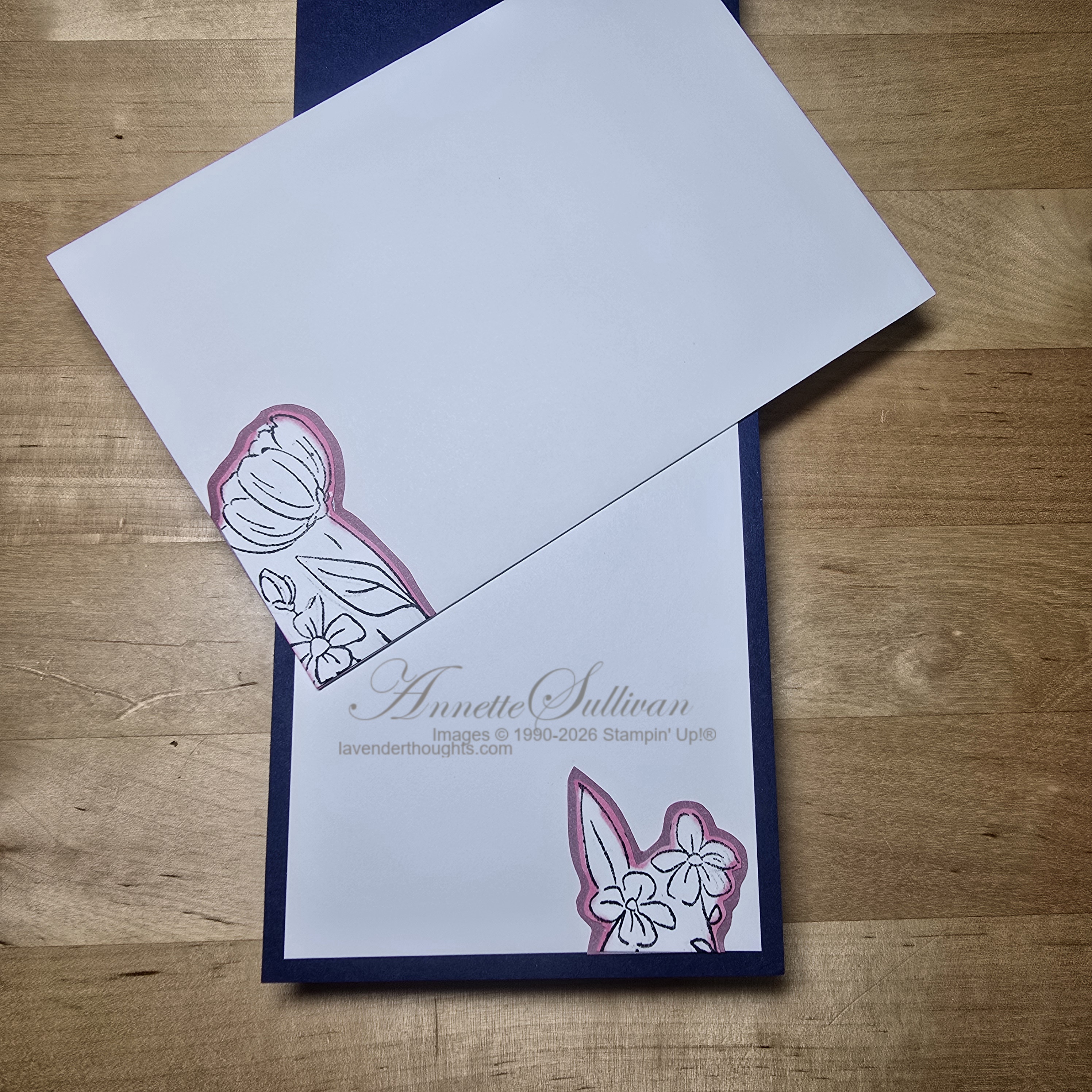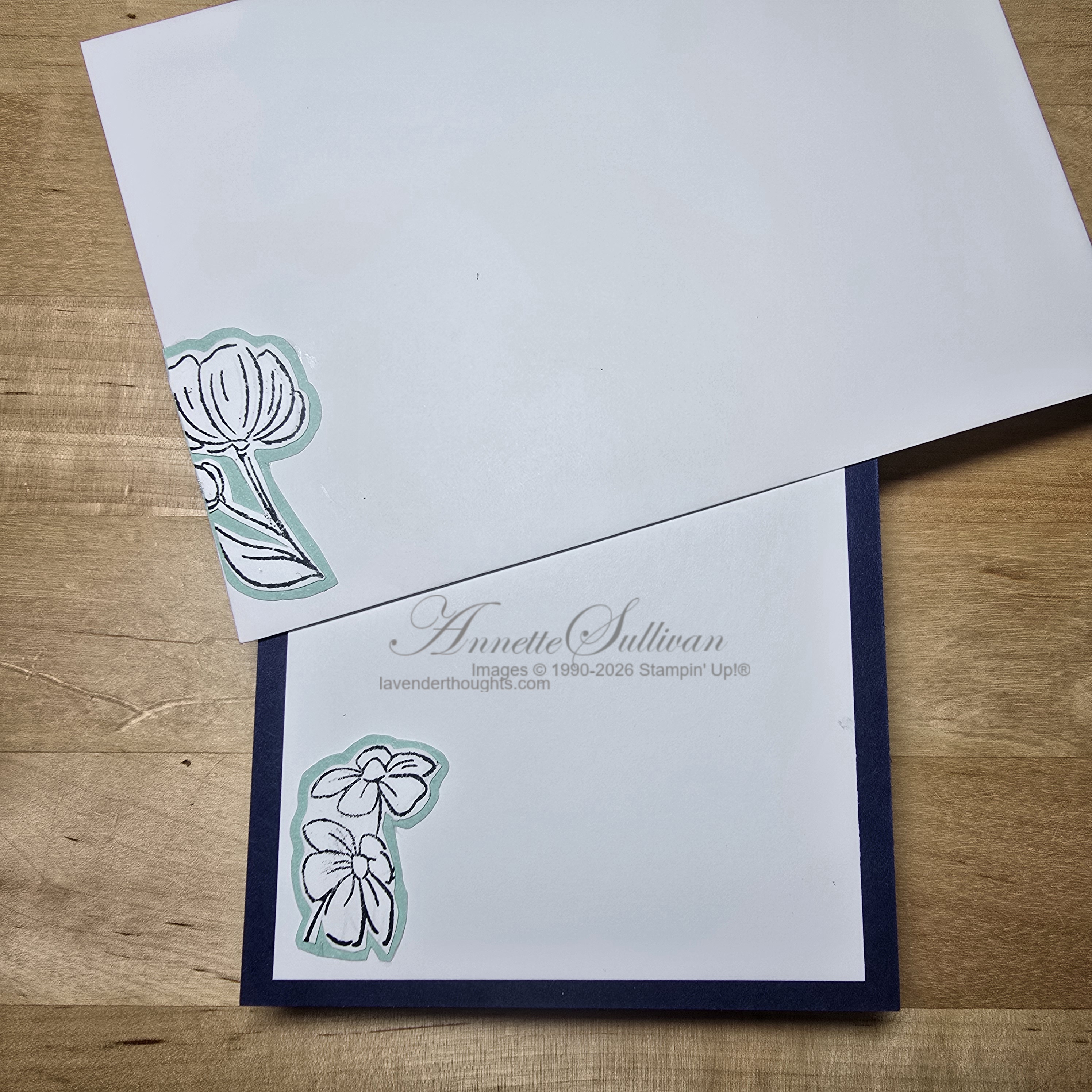 Cards 1 and 2: The Split Negative technique was used to create these two cards. The image was stamped on Basic White with Memento Tuxedo Black ink and again on Night of Navy using Versamark ink and heat embossing with White Embossing Powder. Each image was then cut in half vertically. One of each was put together on a layer then onto a Night of Navy card base. The first one has a layer of Pretty in Pink two-tone cardstock and the second one was die cut with a Perennial Postage Die and then layered onto Pool Party two-tone cardstock. The sentiments come from Blooming Phrases.