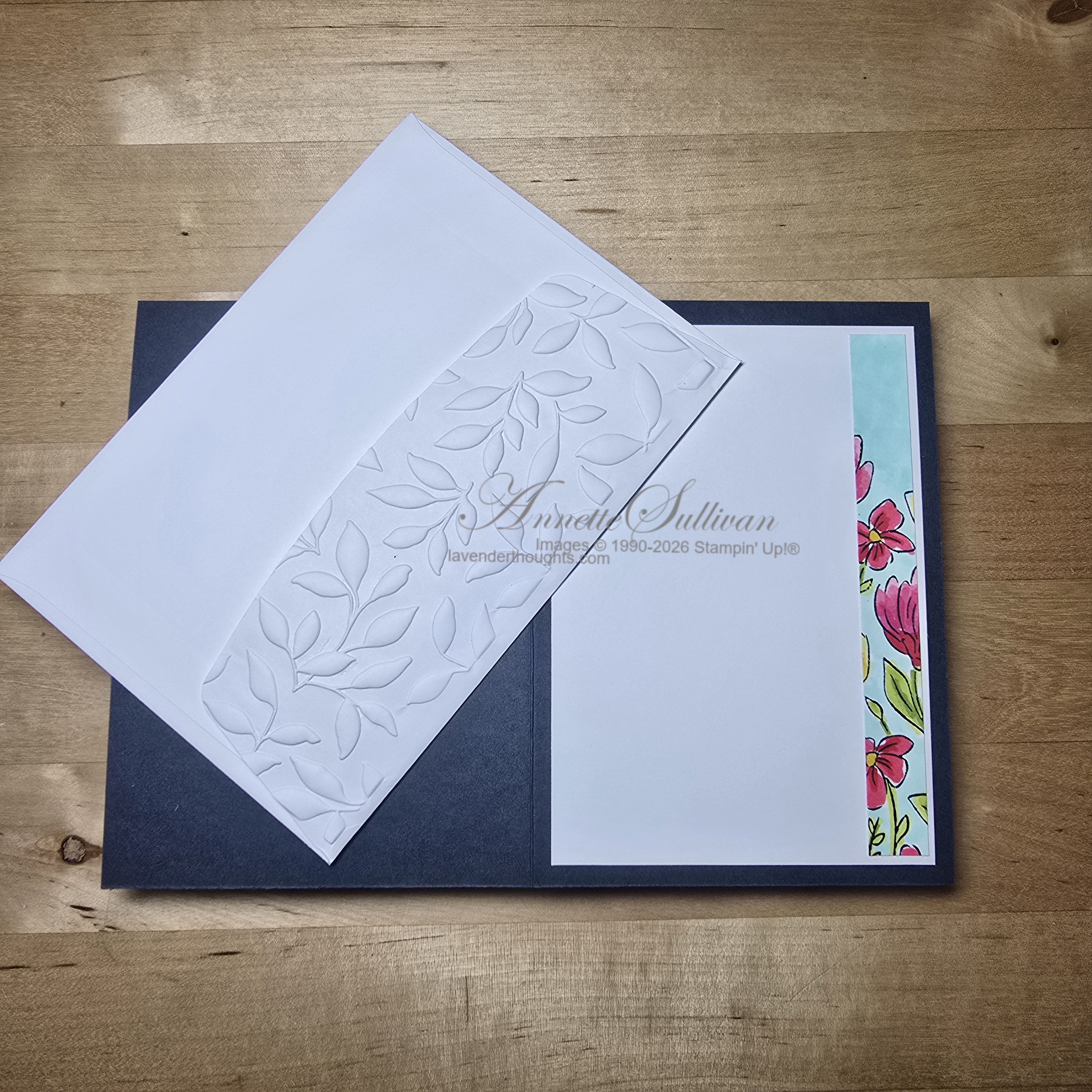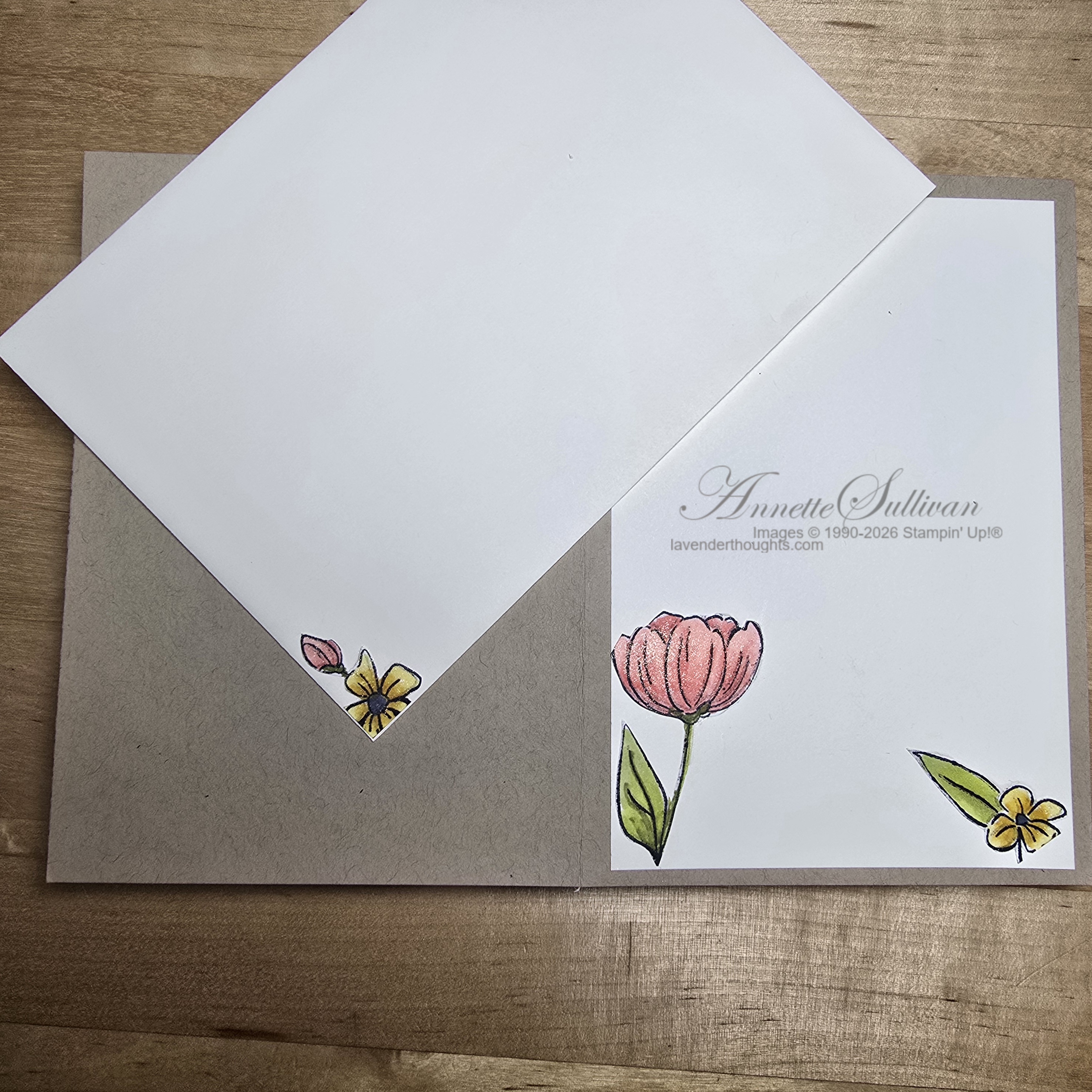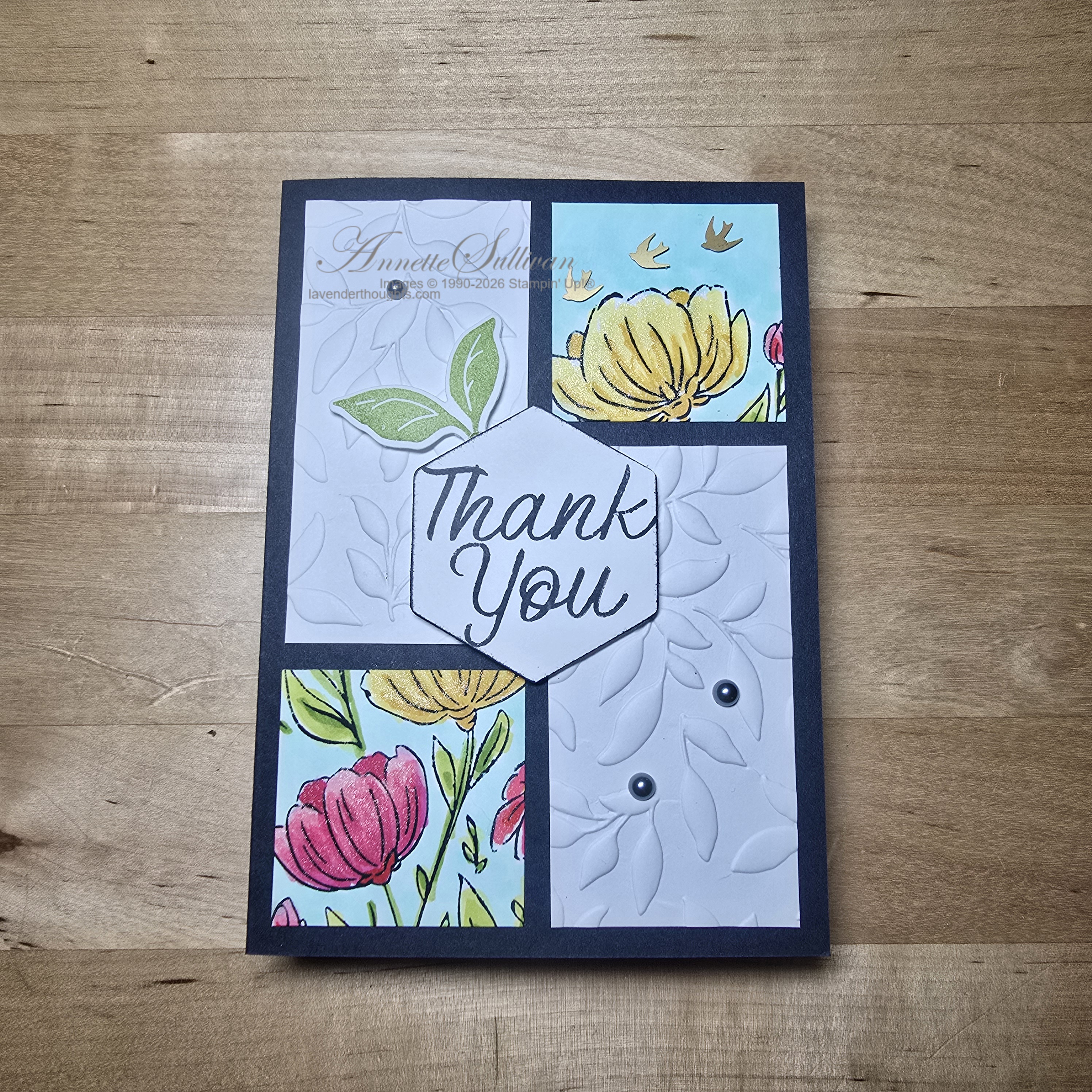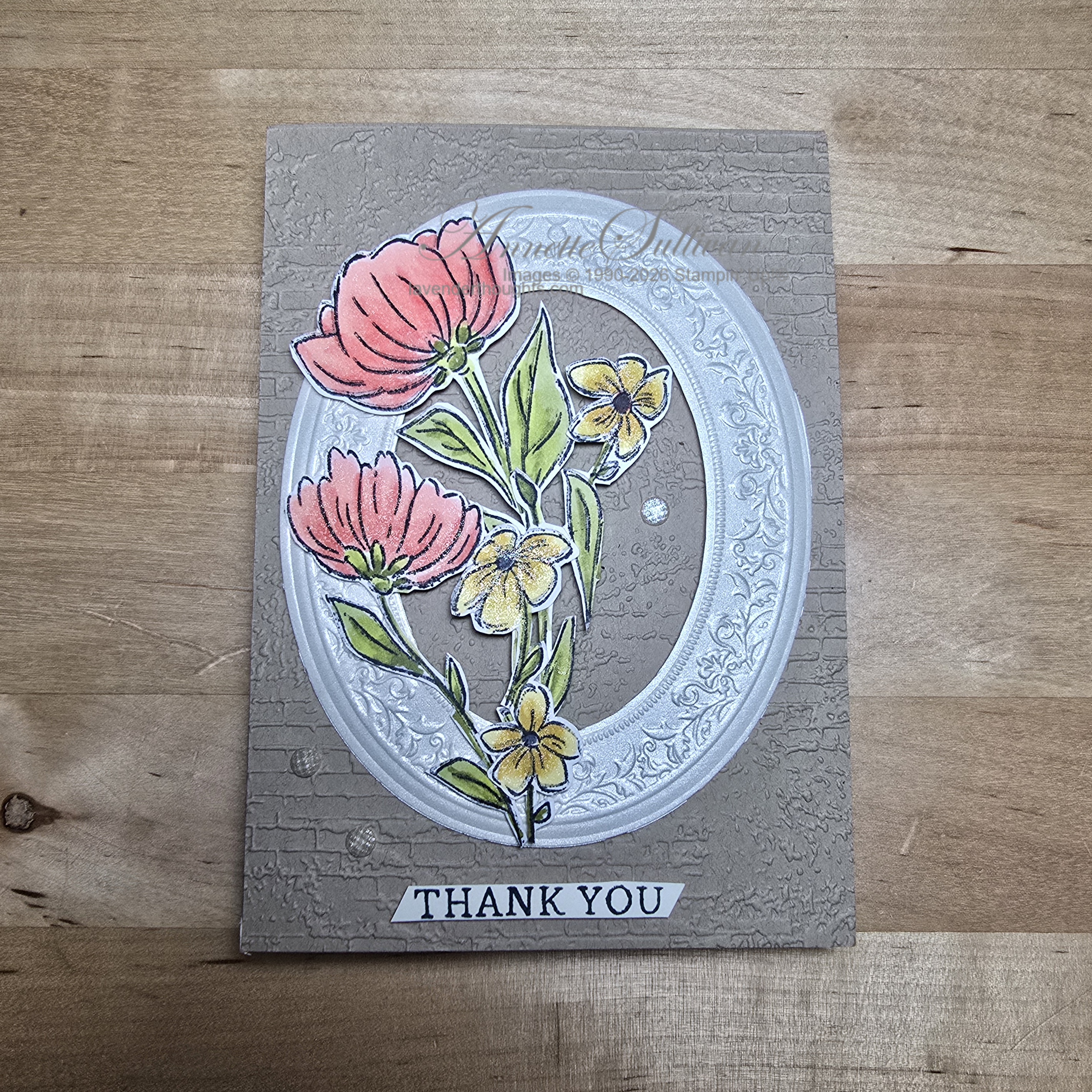 Card 6: The flowers were coloured with Stampin’ Blends alcohol markers – Calypso Coral, Petal Pink, Darling Duckling, Daffodil Delight, Old Olive and Lemon Lime Twist and fussy cut. The card base of Crumb Cake has an Exposed Brick embossed layer. The oval was die cut and embossed with one of the retired Heirloom Frames dies and embossing folders using the retired Pearlescent Specialty Paper.
