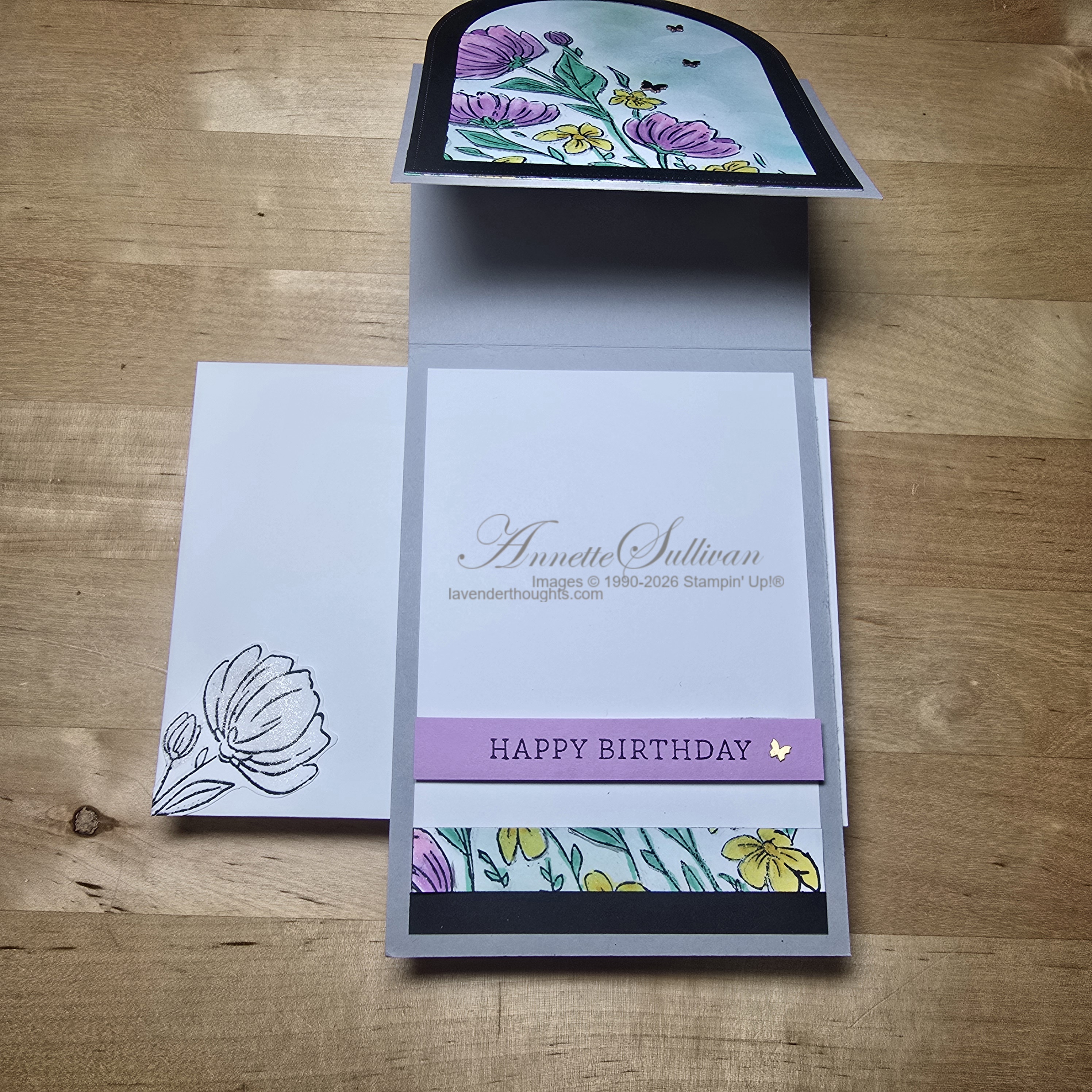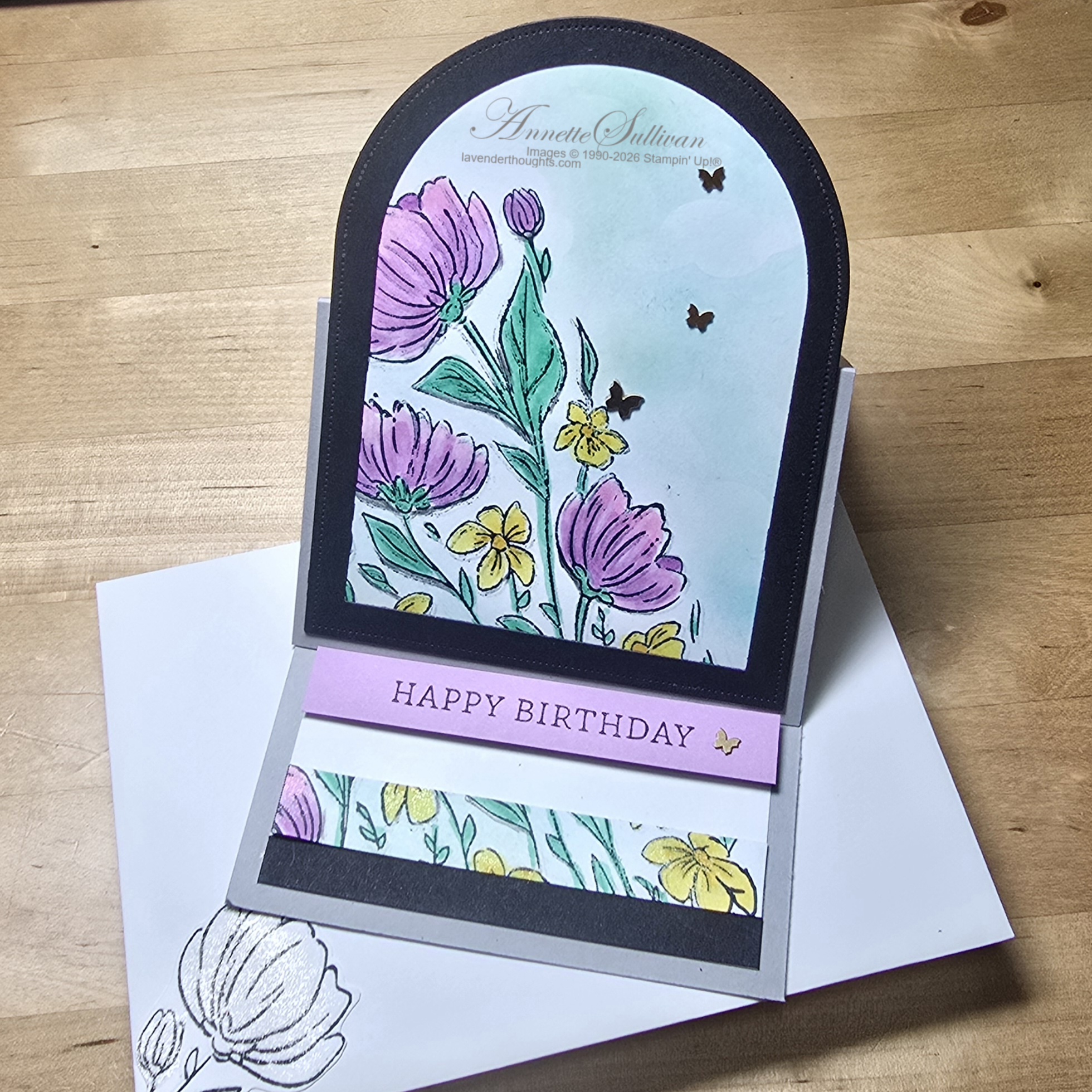Card 3: For this one I stamped part of the image on an angle then coloured it with Stampin Blends alcohol markers – Fresh Freesia, Bubble Bath, Lemon Lolly, Daffodil Delight and Shy Shamrock. I then used a cloud die cut and Balmy Blue ink to create a cloudy background. The everyday Arches Dies provided the shape for this pretty easel card. The card base is Smoky Slate with layers of Basic Black and Basic White and a strip of Fresh Freesia for the easel stopper..