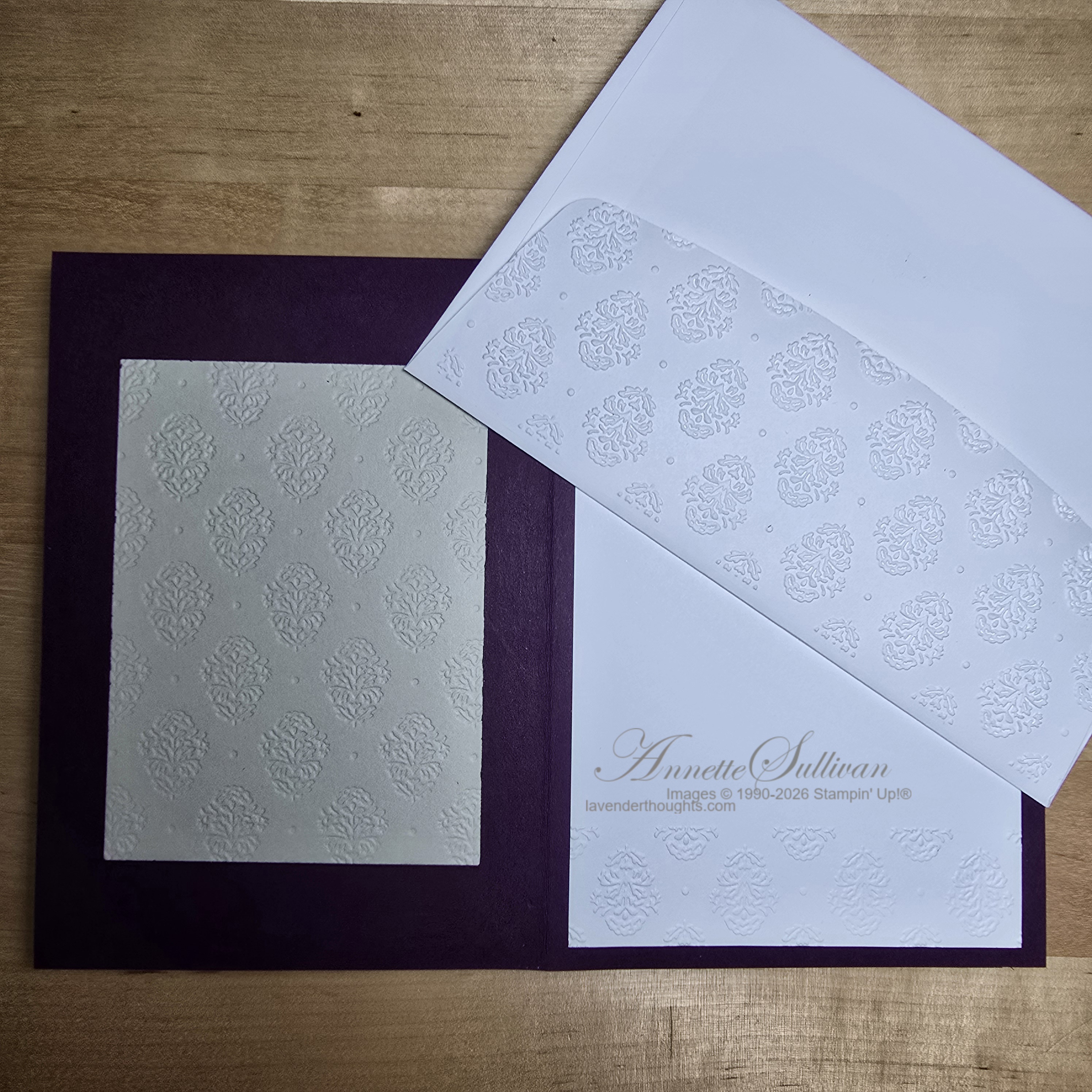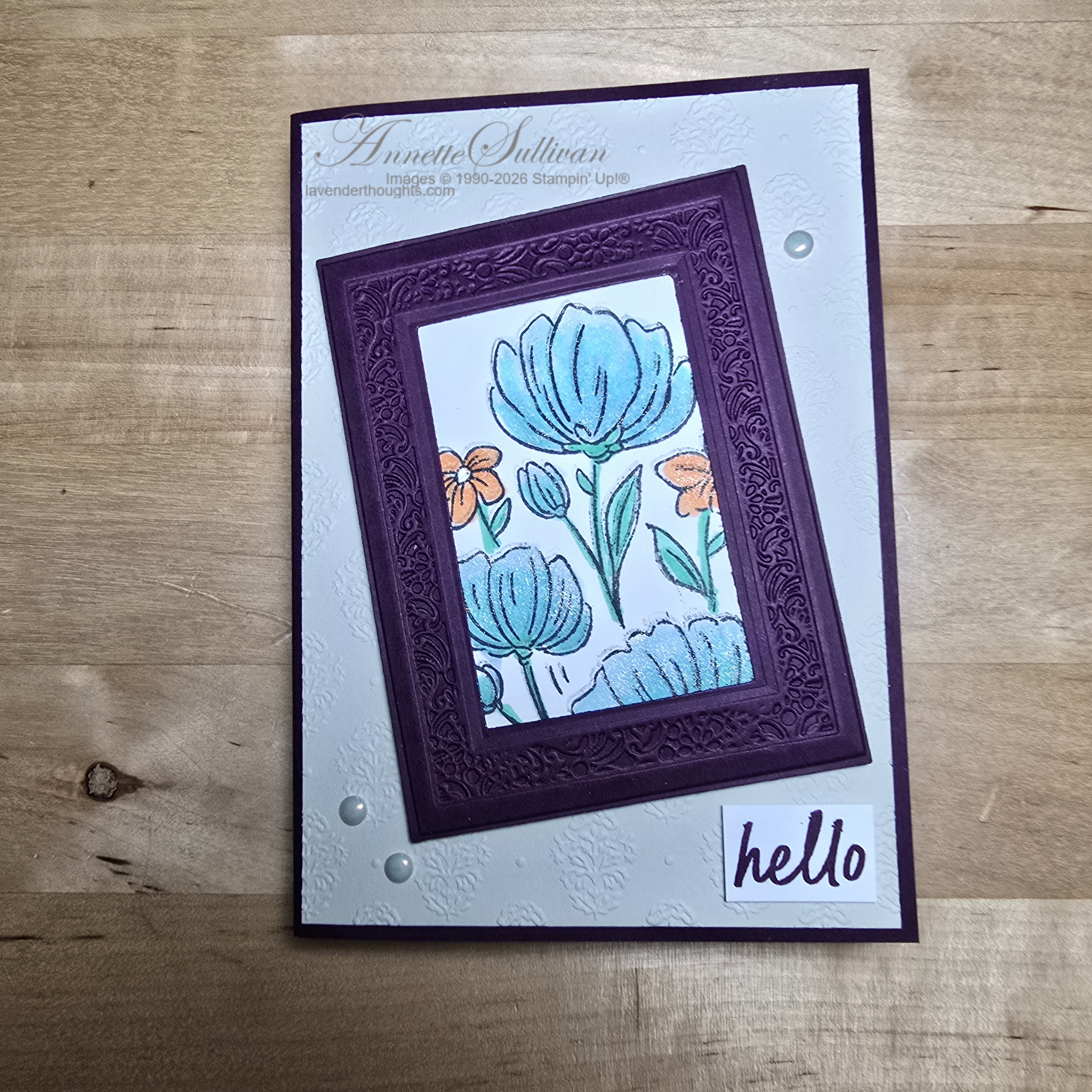 Card 7: This was coloured with Balmy Blue, Summer Splash, Peach Pie and Shy Shamrock Stampin’ Blends. The card base of Blackberry Bliss was layered with a piece of Basic Beige embossed with Damask Designs.