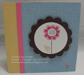 Accessories: 2 3/8″ scallop circle punch, 1 3/4″ circle punch, dimensionals, pink brad [not SU]